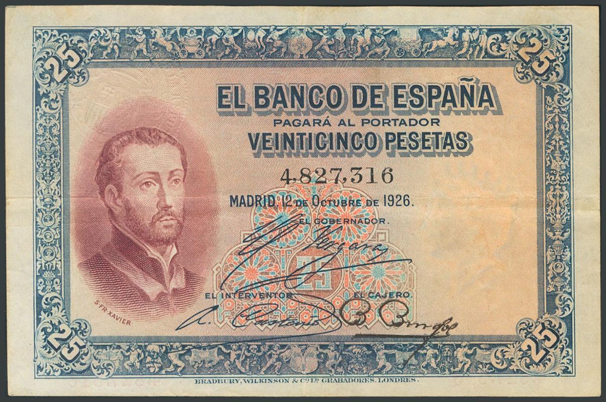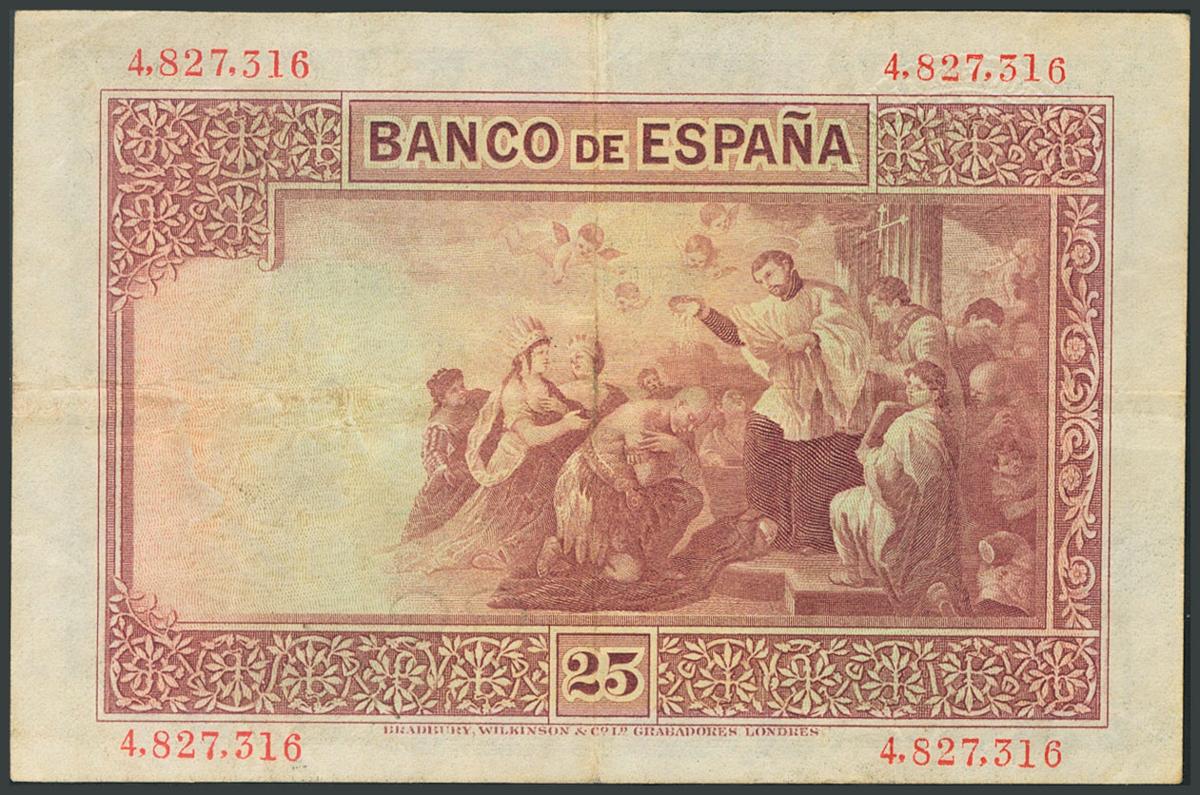 25 Pesetas. 12 de Octubre de 1926. Sin serie. Sello en seco del Gobierno Provisional de la República-14 Abril 1931. (Edifil 2017: 335). Inusual. MBC+.