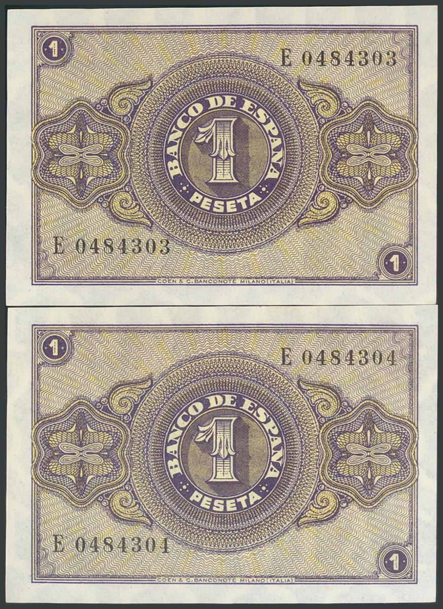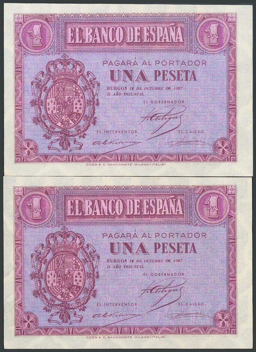1 Peseta. 12 de Octubre de 1937. Pareja correlativa. Serie E. (Edifil 2017: 425a). Apresto original. SC.