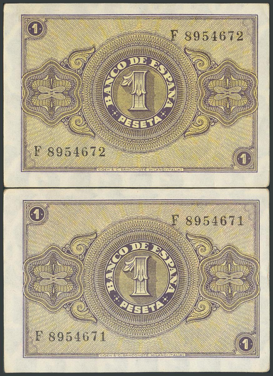 1 Peseta. 12 de Octubre de 1937. Pareja correlativa. Serie F, última serie emitida. (Edifil 2017: 425a). Apresto original. SC-.