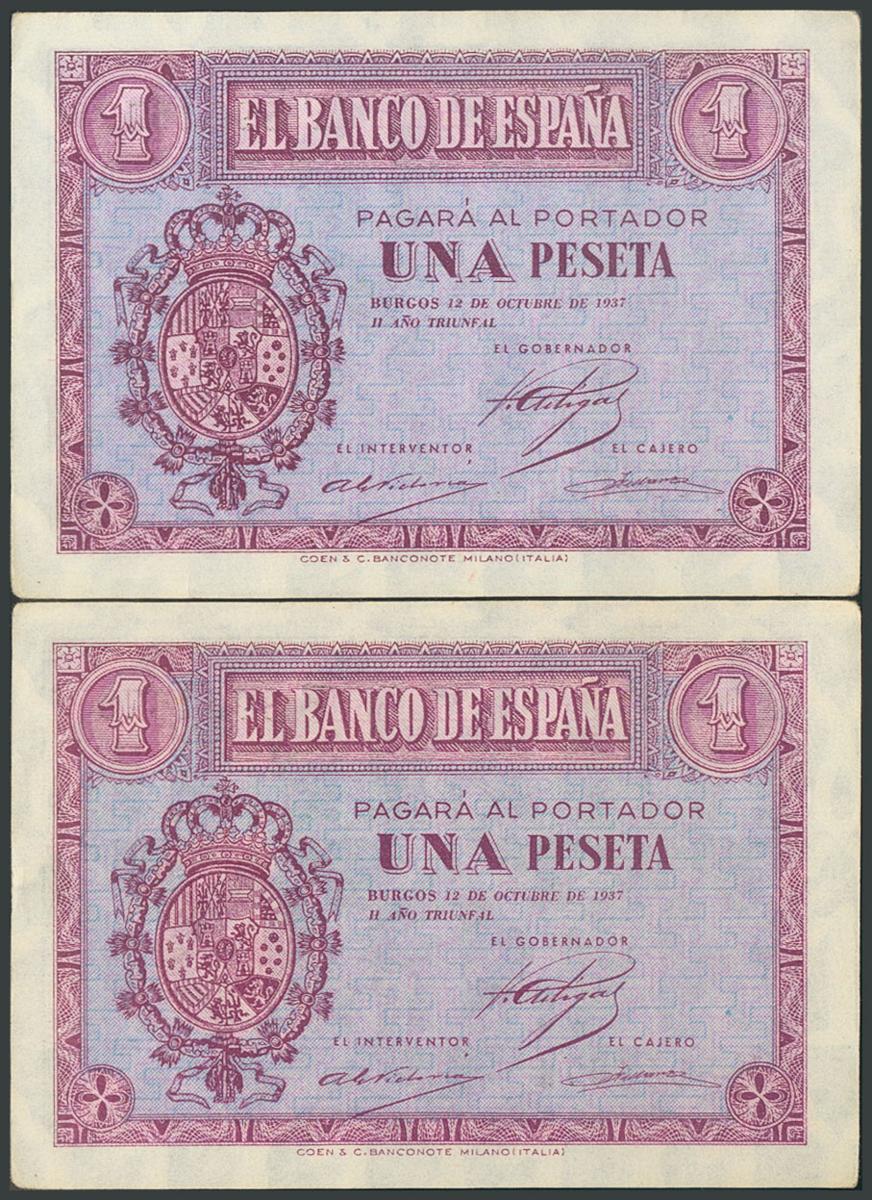 1 Peseta. 12 de Octubre de 1937. Pareja correlativa. Serie F, última serie emitida. (Edifil 2017: 425a). Apresto original. SC-.