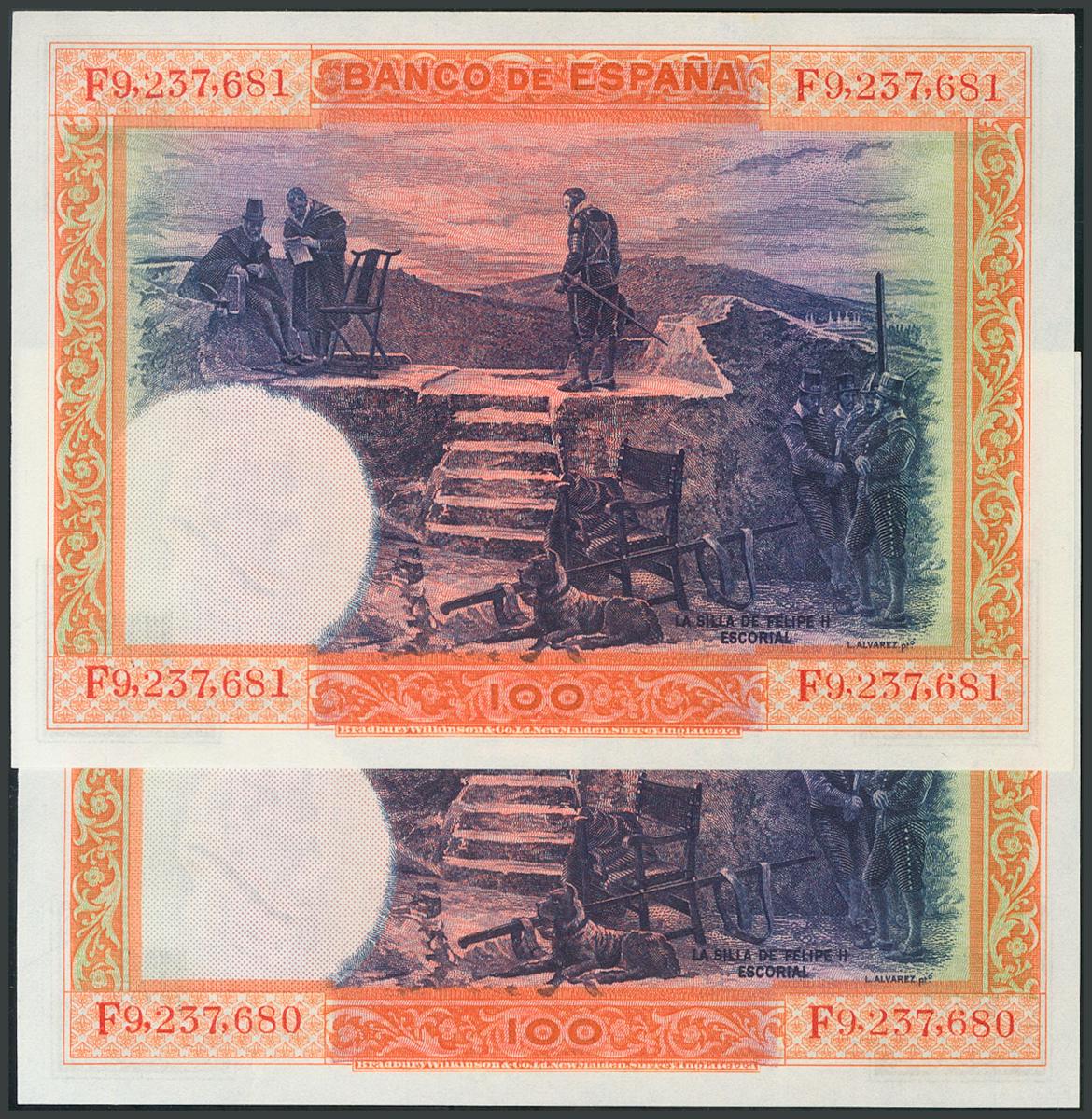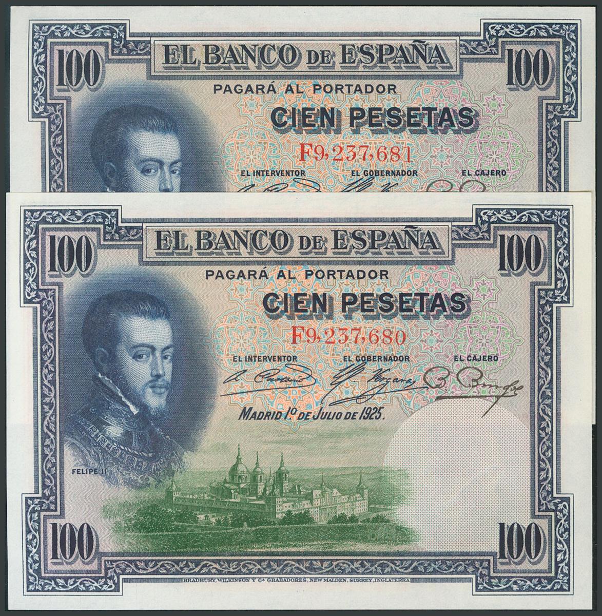 100 Pesetas. 1 de Julio de 1925. Pareja correlativa. Serie F. (Edifil 2017: 350). Apresto original. SC.