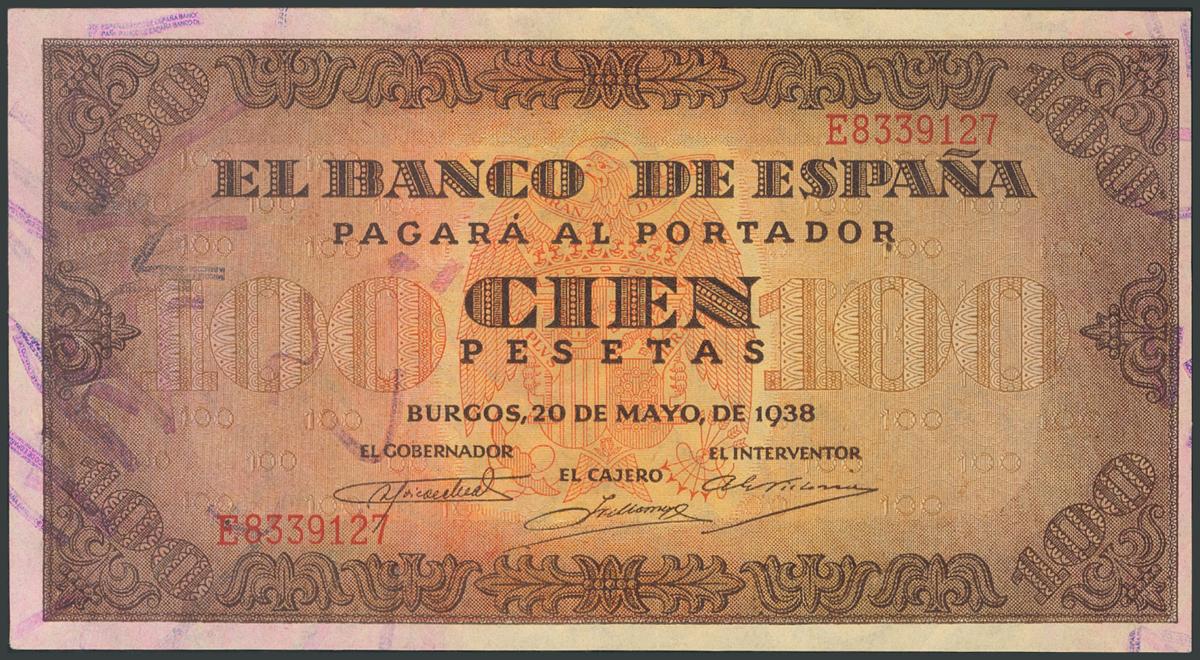 100 Pesetas. 20 de Mayo de 1938. Serie E. (Edifil 2017: 432a). Apresto original, margen derecho ligeramente rebajado. SC-.