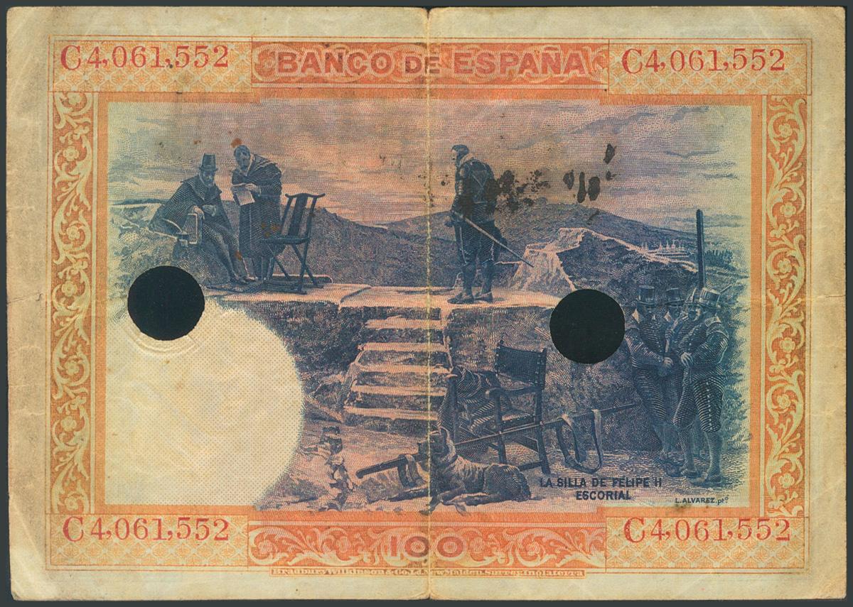 100 Pesetas. 1 de Julio de 1925. Inutilizado. Serie C. (Edifil 2017: 355). BC. (estudios recientes sugieren la posibilidad de que esta marca haya podido ser estampada contemporáneamente)