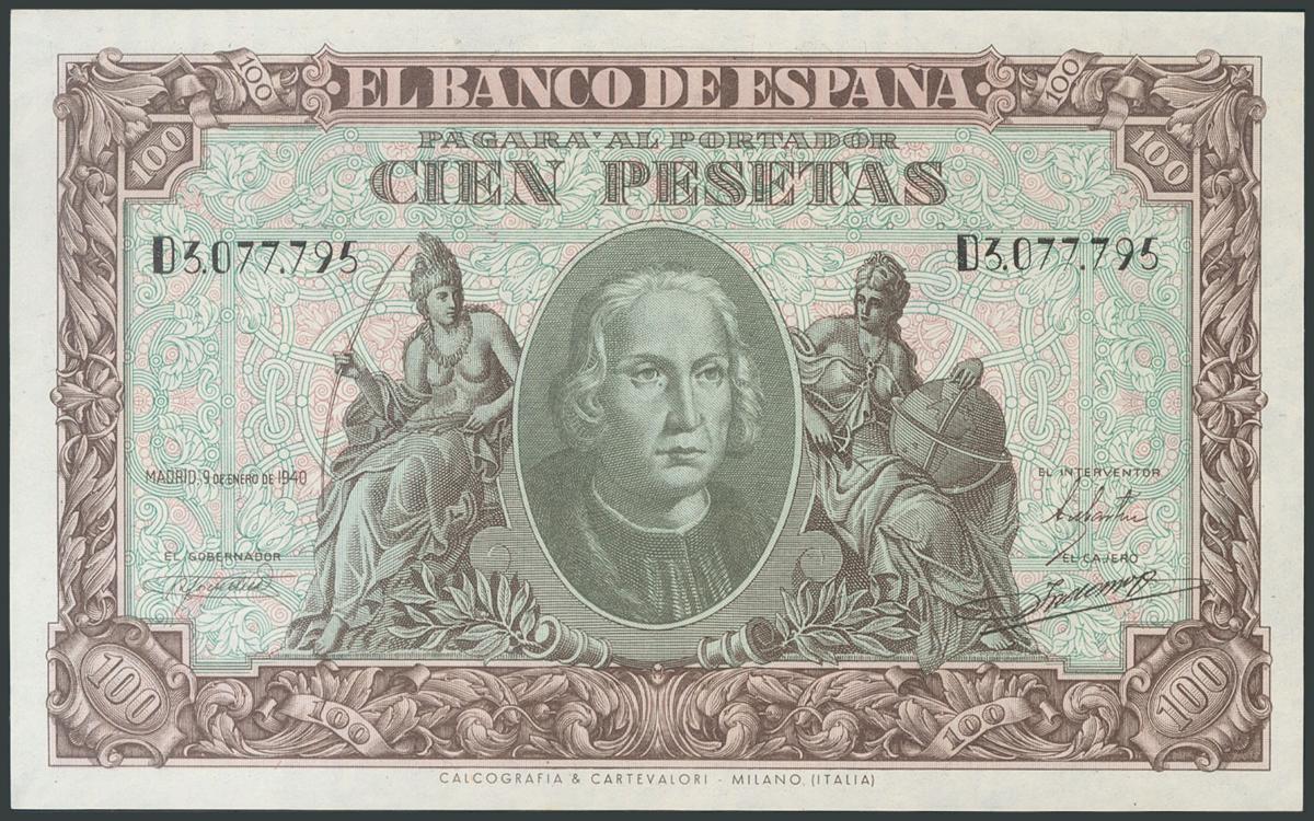 100 Pesetas. 9 de Enero de 1940. Serie D. (Edifil 2017: 438a). Inusual en esta conservación, apresto original. SC.