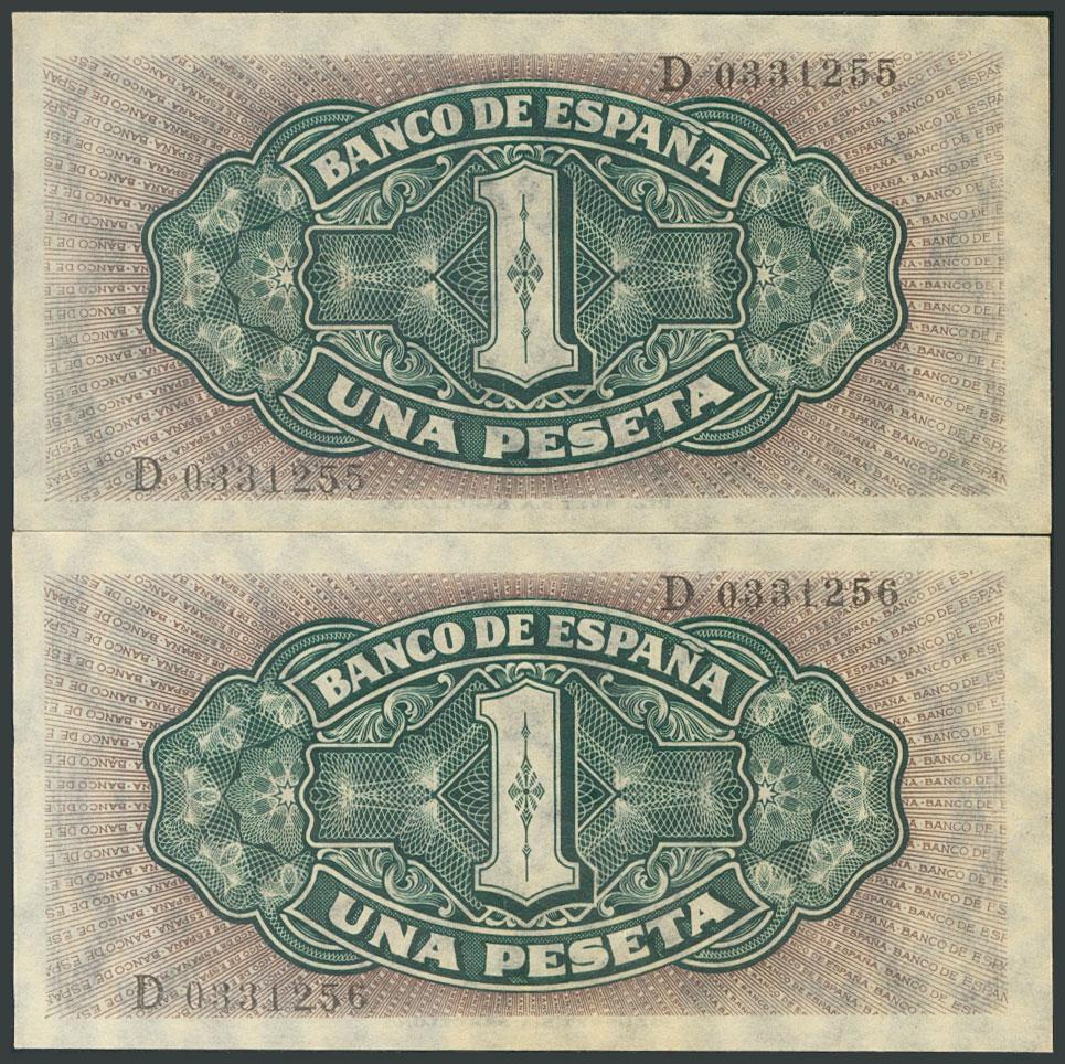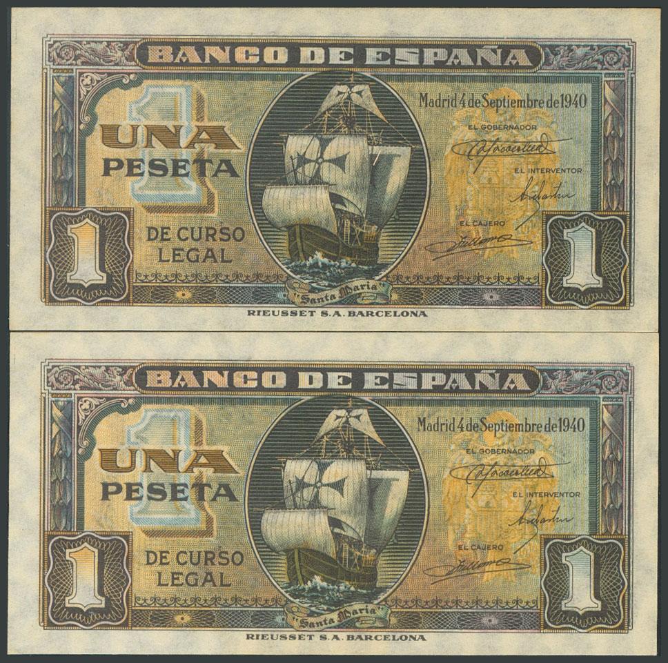 1 Peseta. 4 de Septiembre de 1940. Pareja correlativa. Serie D. (Edifil 2017: 442a). Apresto original. SC.