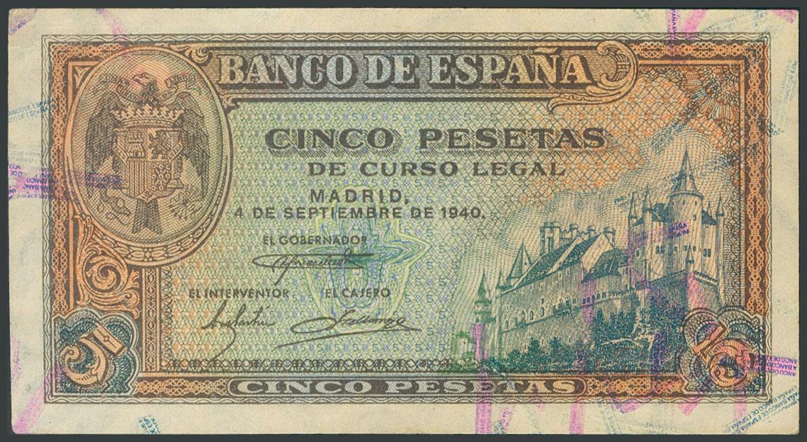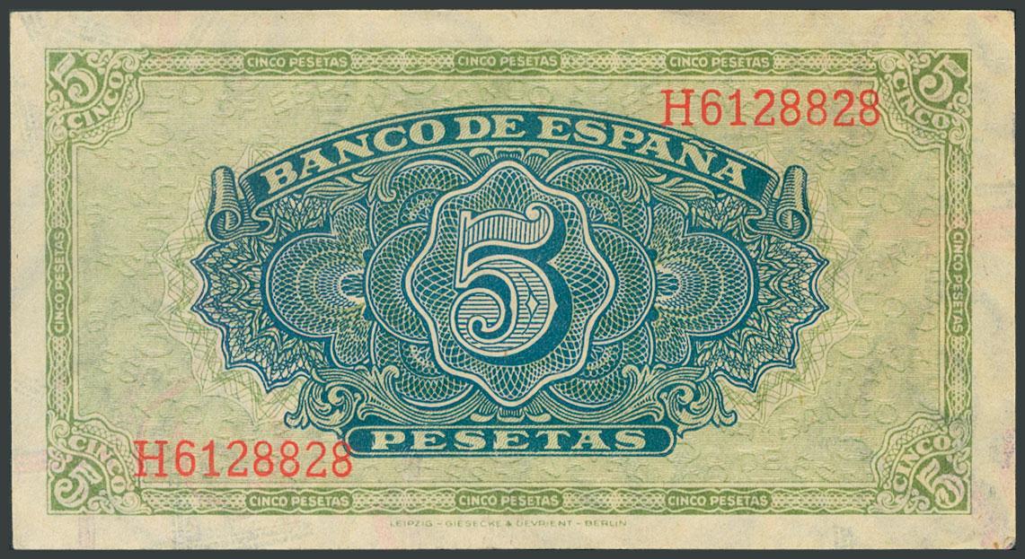 5 Pesetas. 4 de Septiembre de 1940. Serie H. (Edifil 2017: 443a). Conserva gran parte del apresto original. EBC+.