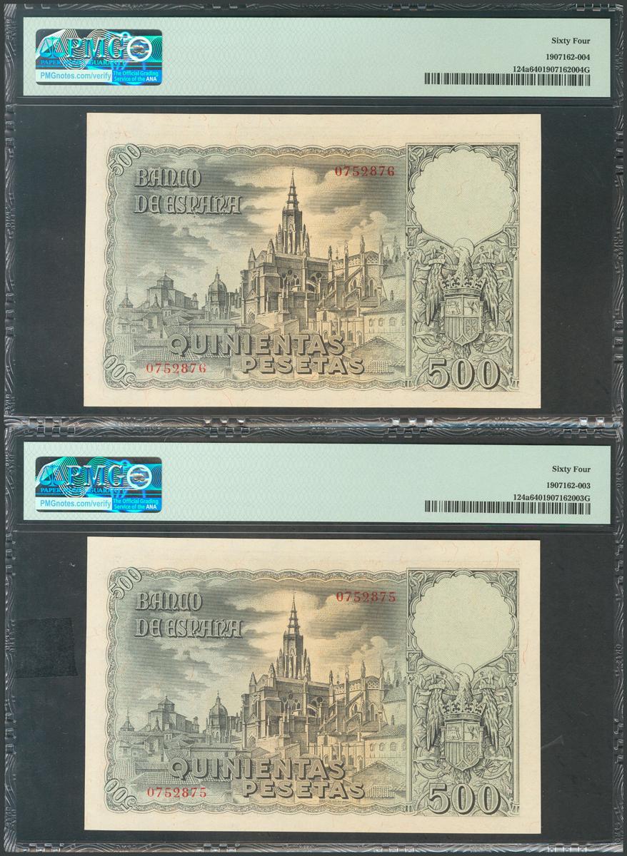 500 Pesetas. 21 de Octubre de 1940. Pareja correlativa. Sin serie. (Edifil 2017: 444). Rarísima. SC. Encapsulado PMG64, ambos. (para hacerse una idea de la rareza de los billetes en esta calidad, PMG otorga a día 1 de Septiembre de 2020 la cuarta mejor calificación a estos billetes junto a otros ocho billetes, sólo superados por tres billetes graduados con 64EPQ(2) y 65EPQ).
