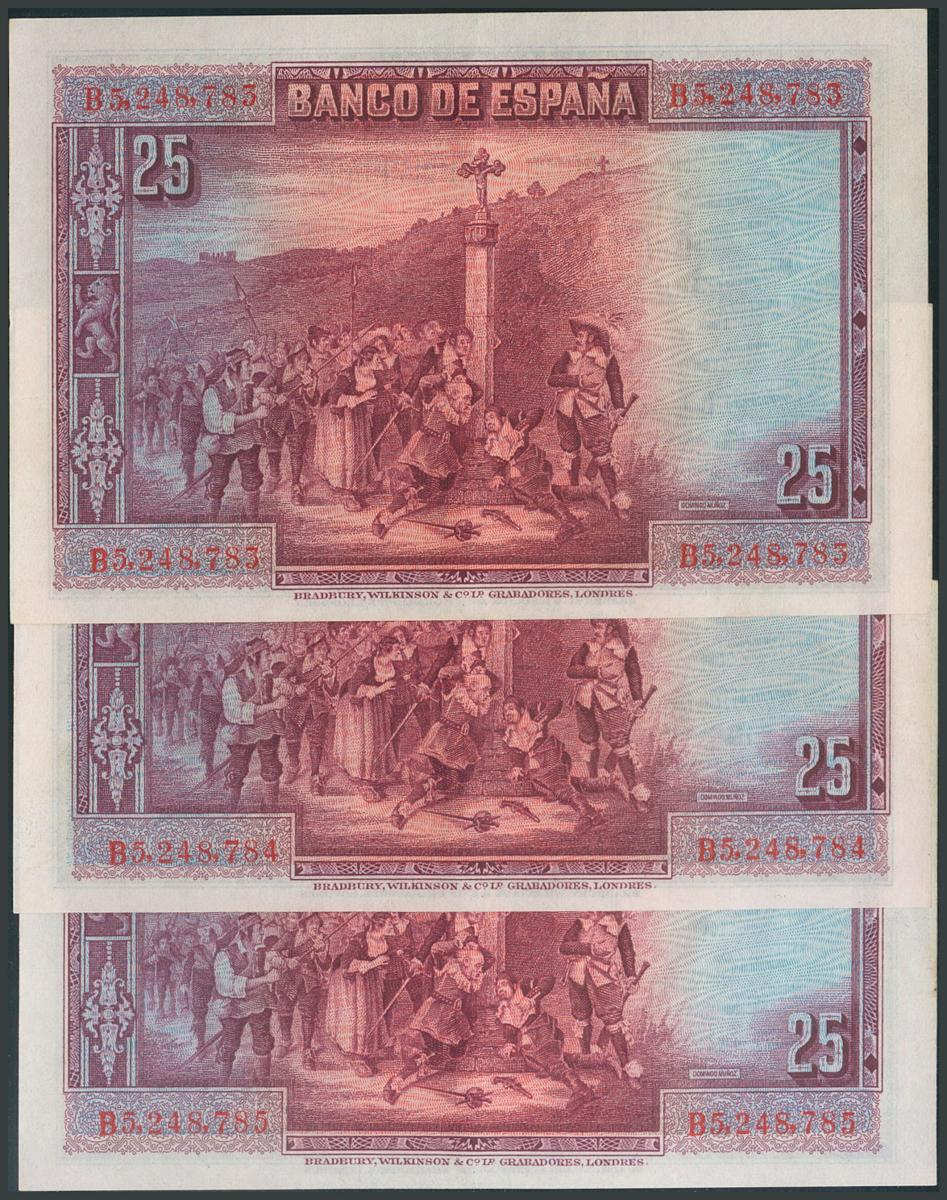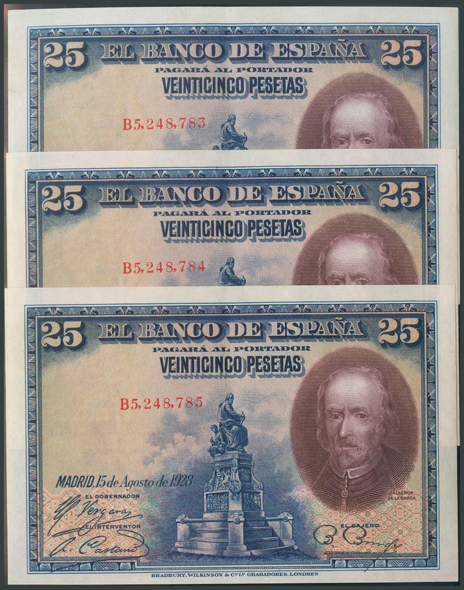 25 Pesetas. 15 de Agosto de 1925. Trío correlativo. Serie B. (Edifil 2017: 353). Apresto original, ondulación vertical sin romper fibra. EBC+.