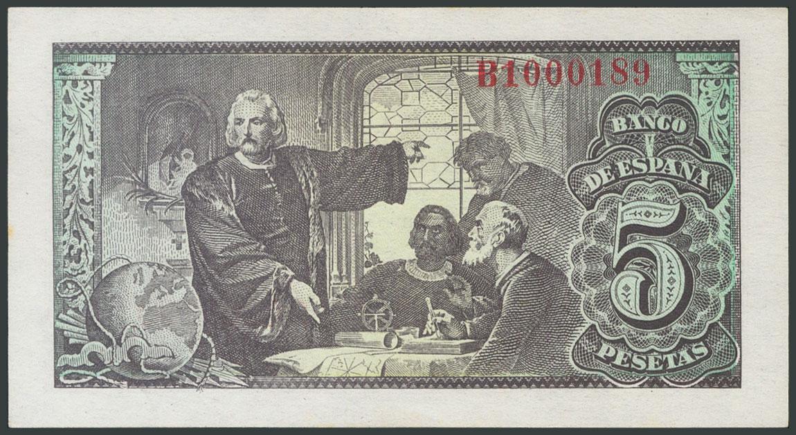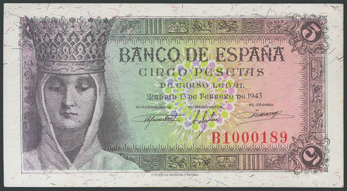 5 Pesetas. 13 de Febrero de 1943. Serie B. (Edifil 2017: 446a). Apresto original y puntito en el margen derecho. SC-.