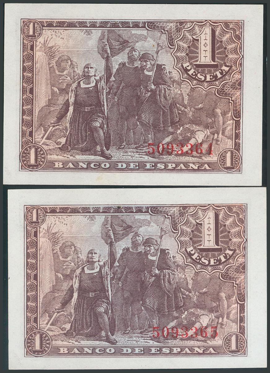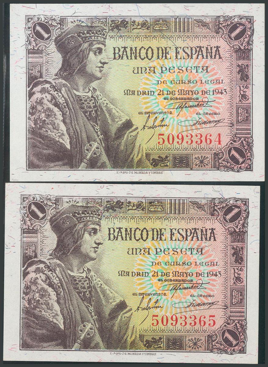 1 Peseta. 21 de Mayo de 1943. Pareja correlativa. Sin serie. (Edifil 2017: 447). Apresto original. SC.