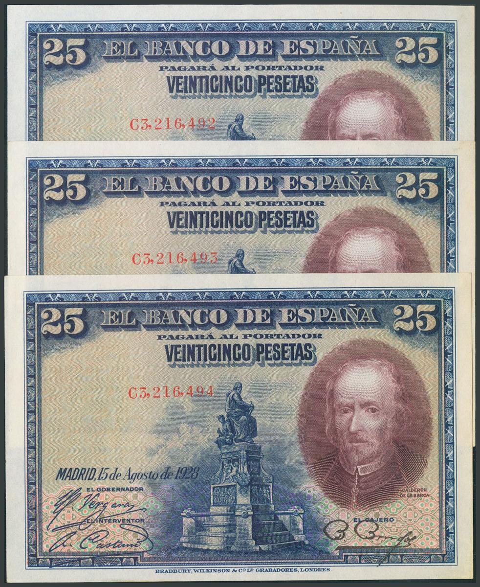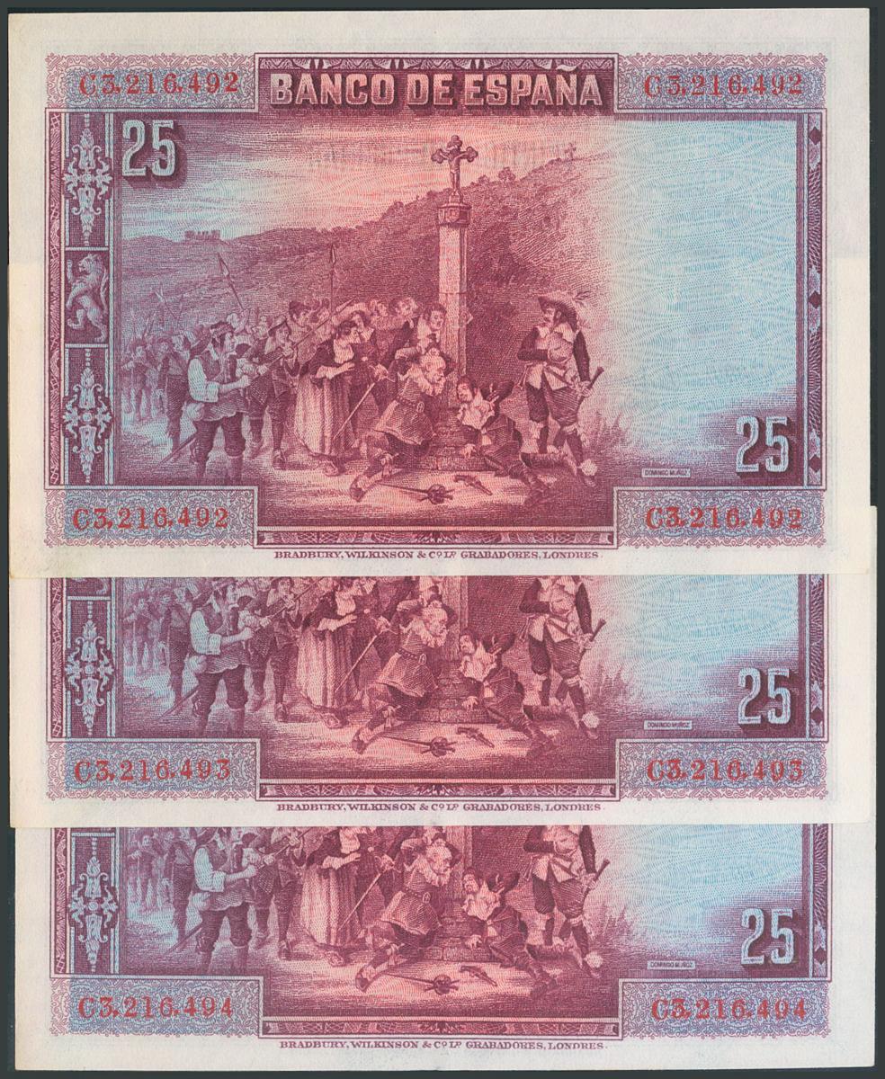 25 Pesetas. 15 de Agosto de 1925. Trío correlativo. Serie C. (Edifil 2017: 353). Apresto original, ondulación vertical sin romper fibra. EBC+.