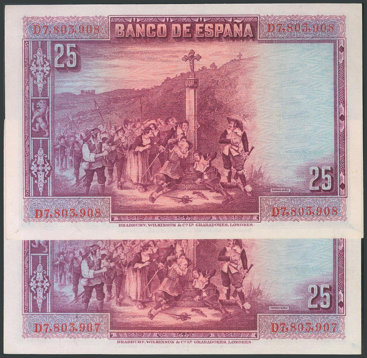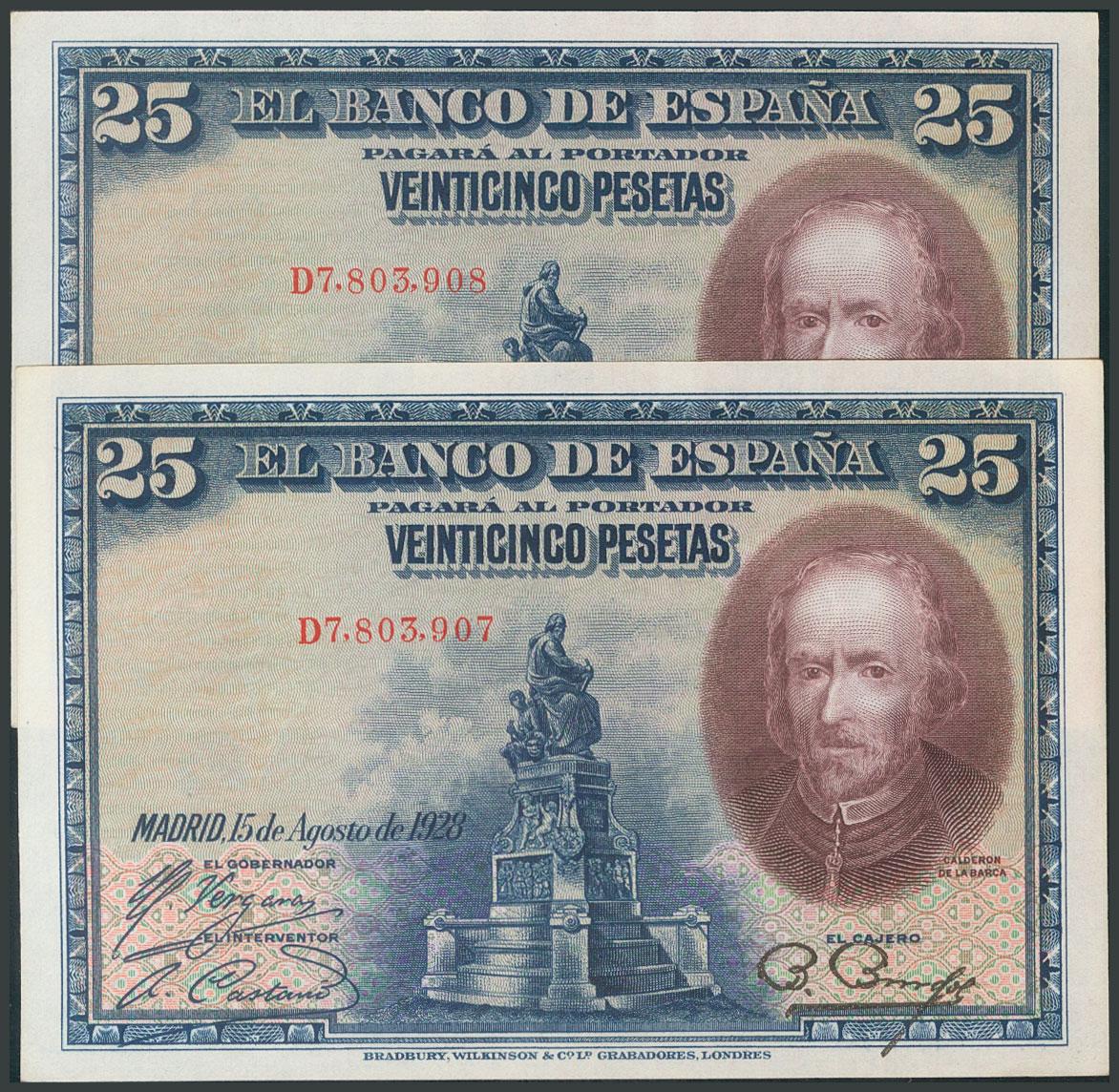 25 Pesetas. 15 de Agosto de 1928. Pareja correlativa. Serie D. (Edifil 2017: 353). Apresto original. SC.