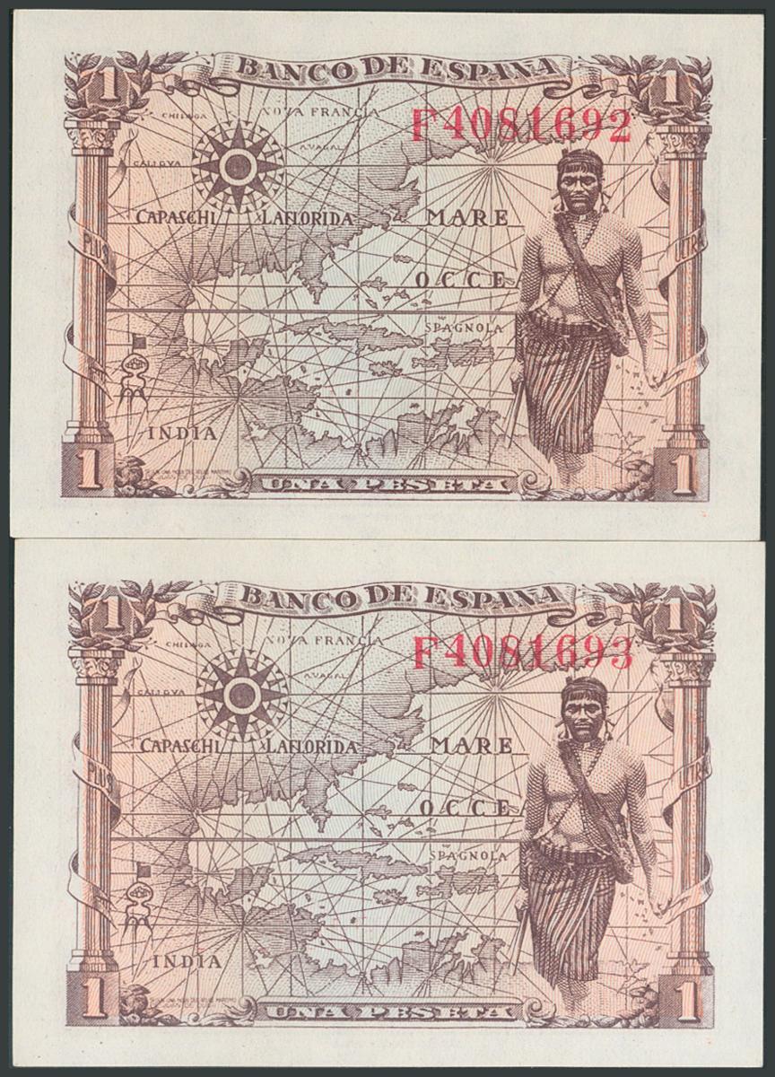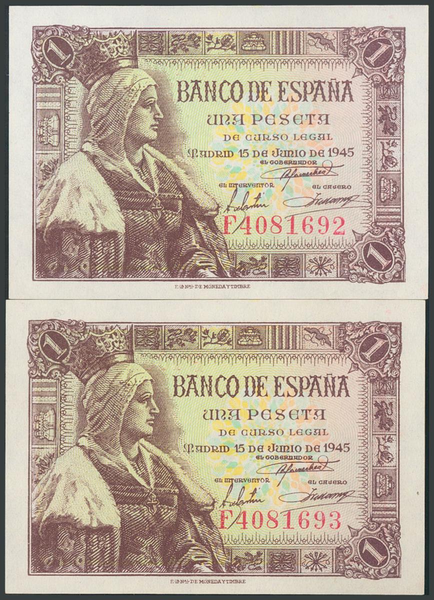 1 Peseta. 15 de Junio de 1945. Pareja correlativa. Serie F. (Edifil 2017: 448a). Apresto original. SC/SC-.