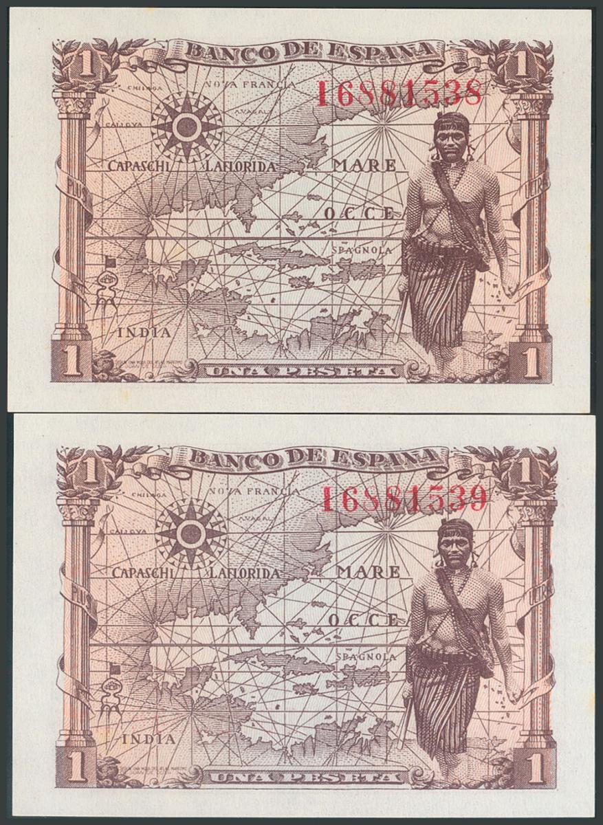 1 Peseta. 15 de Junio de 1945. Pareja correlativa. Serie I. (Edifil 2017: 448a). Apresto original. SC/SC-.