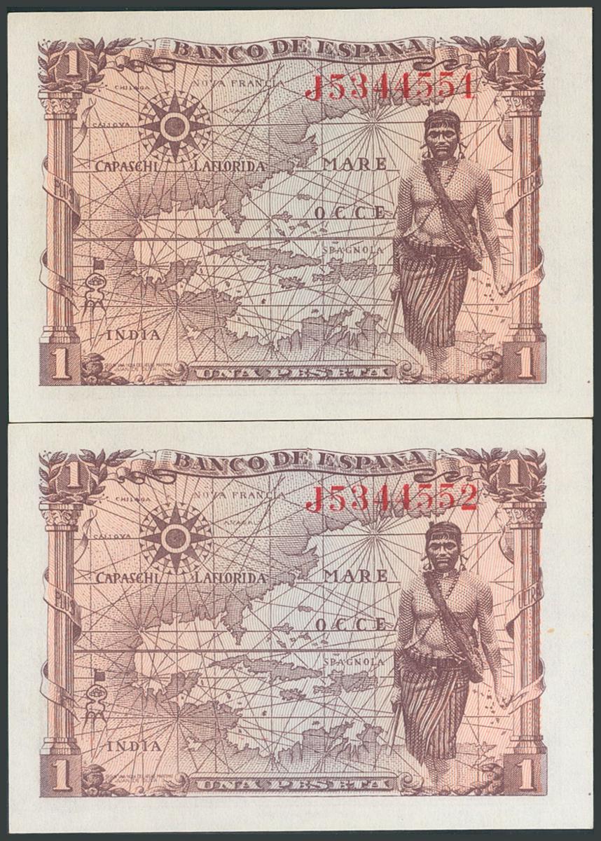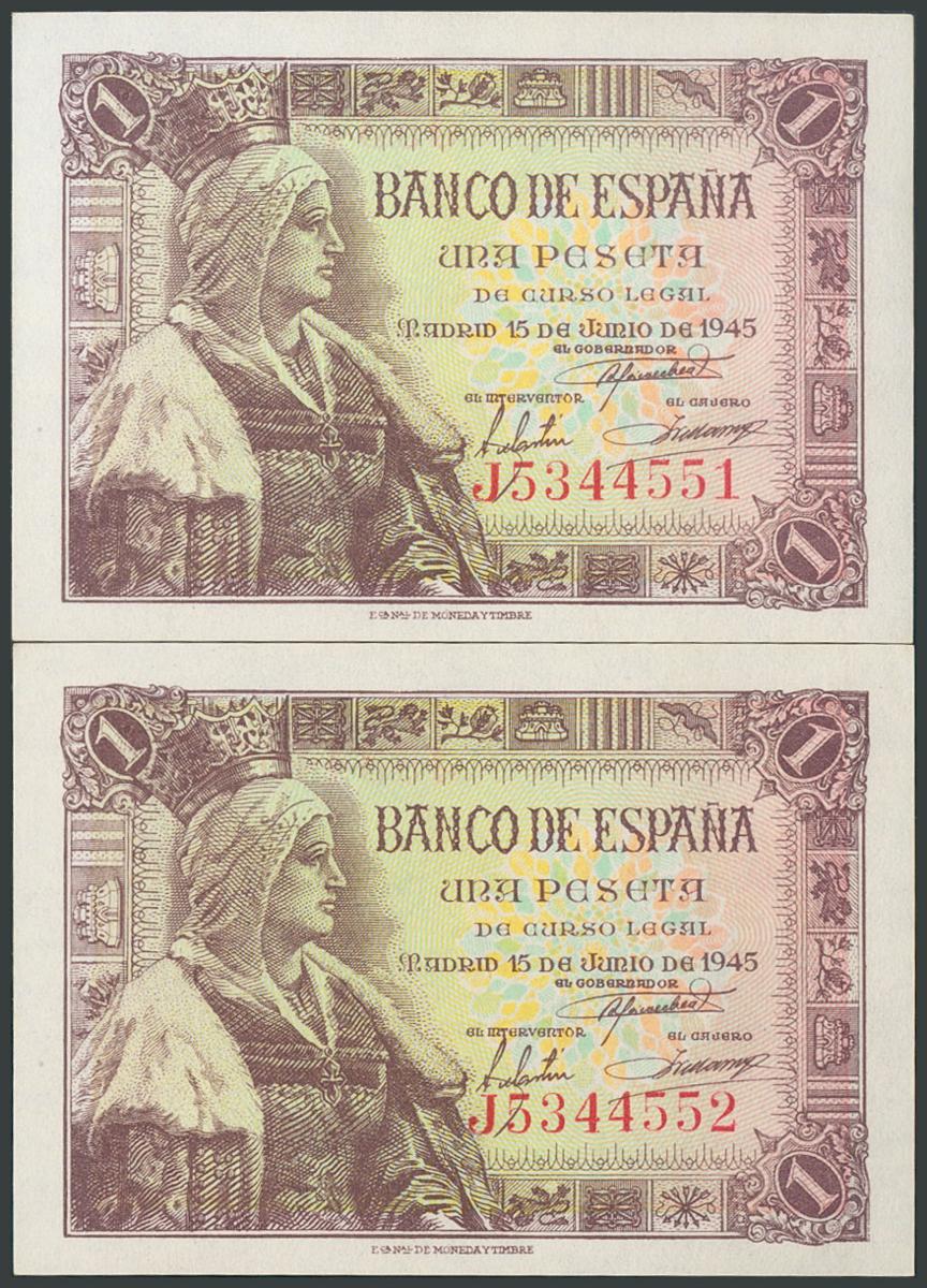 1 Peseta. 15 de Junio de 1945. Pareja correlativa. Serie J. (Edifil 2017: 448a). Apresto original. SC.
