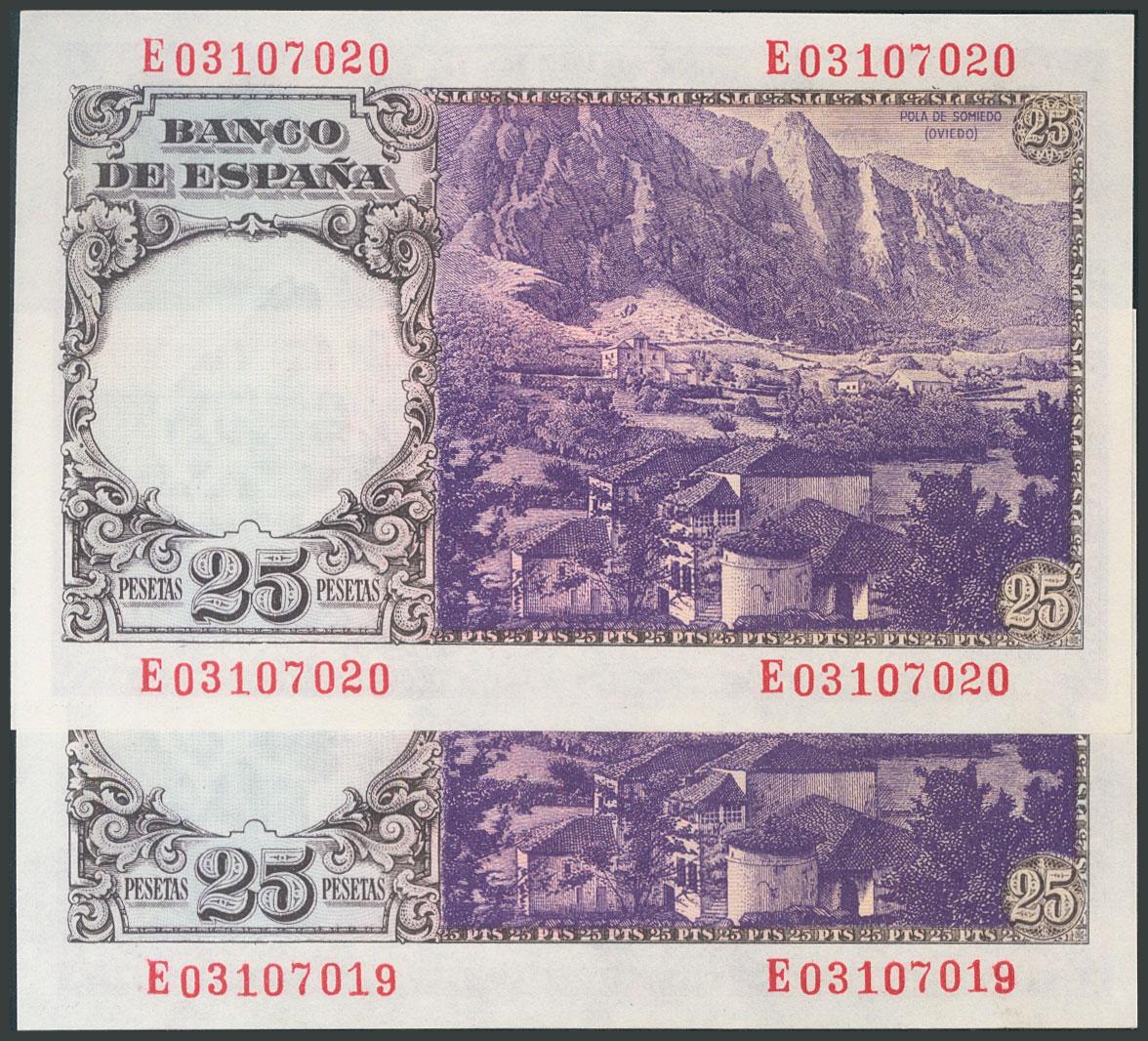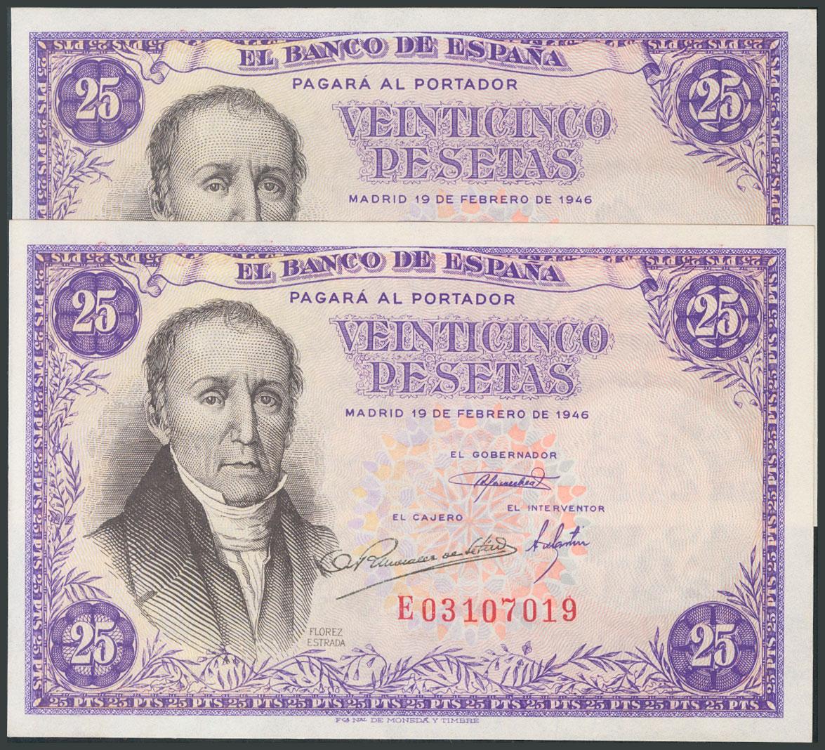 25 Pesetas. 19 de Febrero de 1946. Pareja correlativa. Serie E. (Edifil 2017: 450a). Apresto original. SC.