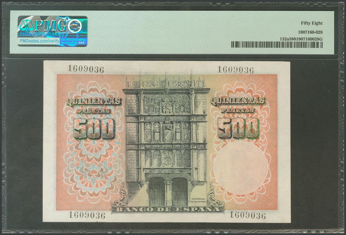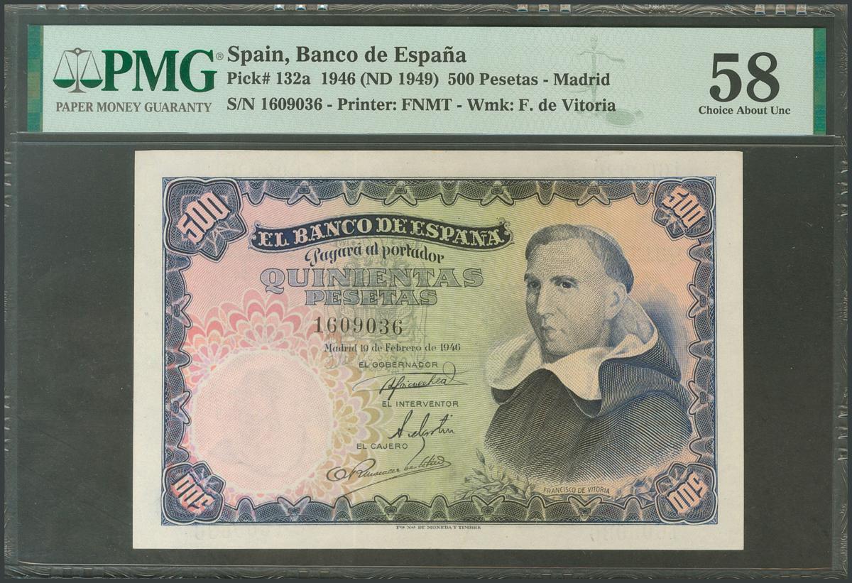 500 Pesetas. 19 de Febrero de 1946. Sin serie. (Edifil 2017: 452). Inusual así. EBC+. Encapsulado PMG58.