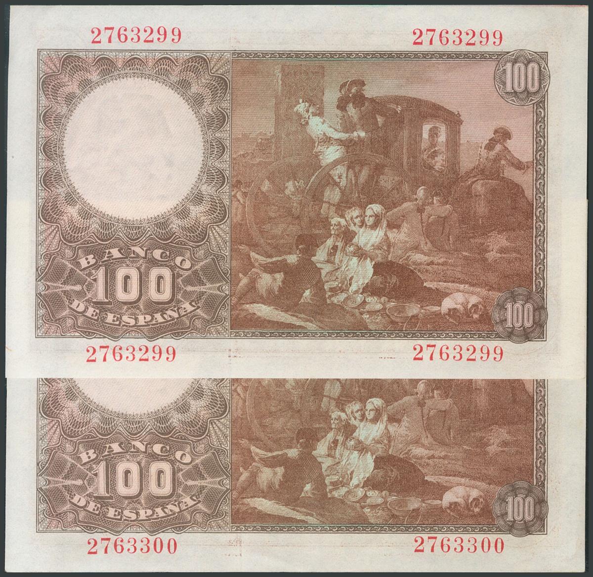 100 Pesetas. 2 de Mayo de 1948. Pareja correlativa. Sin serie. (Edifil 2017: 456). Ambos billetes presentan su apresto original. SC-/EBC+.