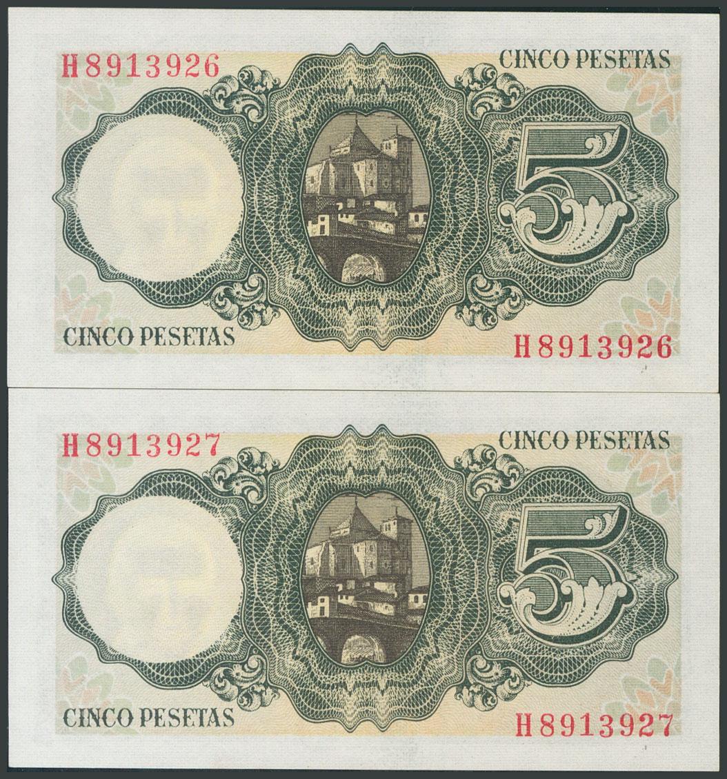 5 Pesetas. 16 de Agosto de 1951. Pareja correlativa. Serie H. (Edifil 2017: 459a). Apresto original. SC.