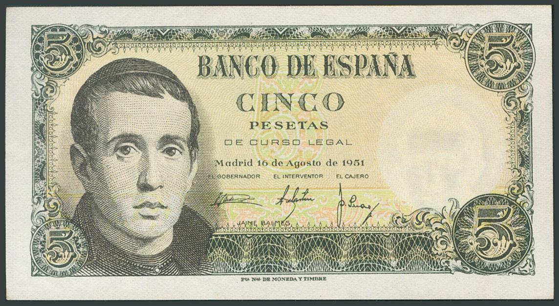 5 Pesetas. 16 de Agosto de 1951. Serie 1E. (Edifil 2017: 459a). Apresto original. SC.