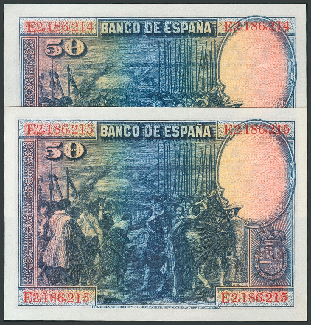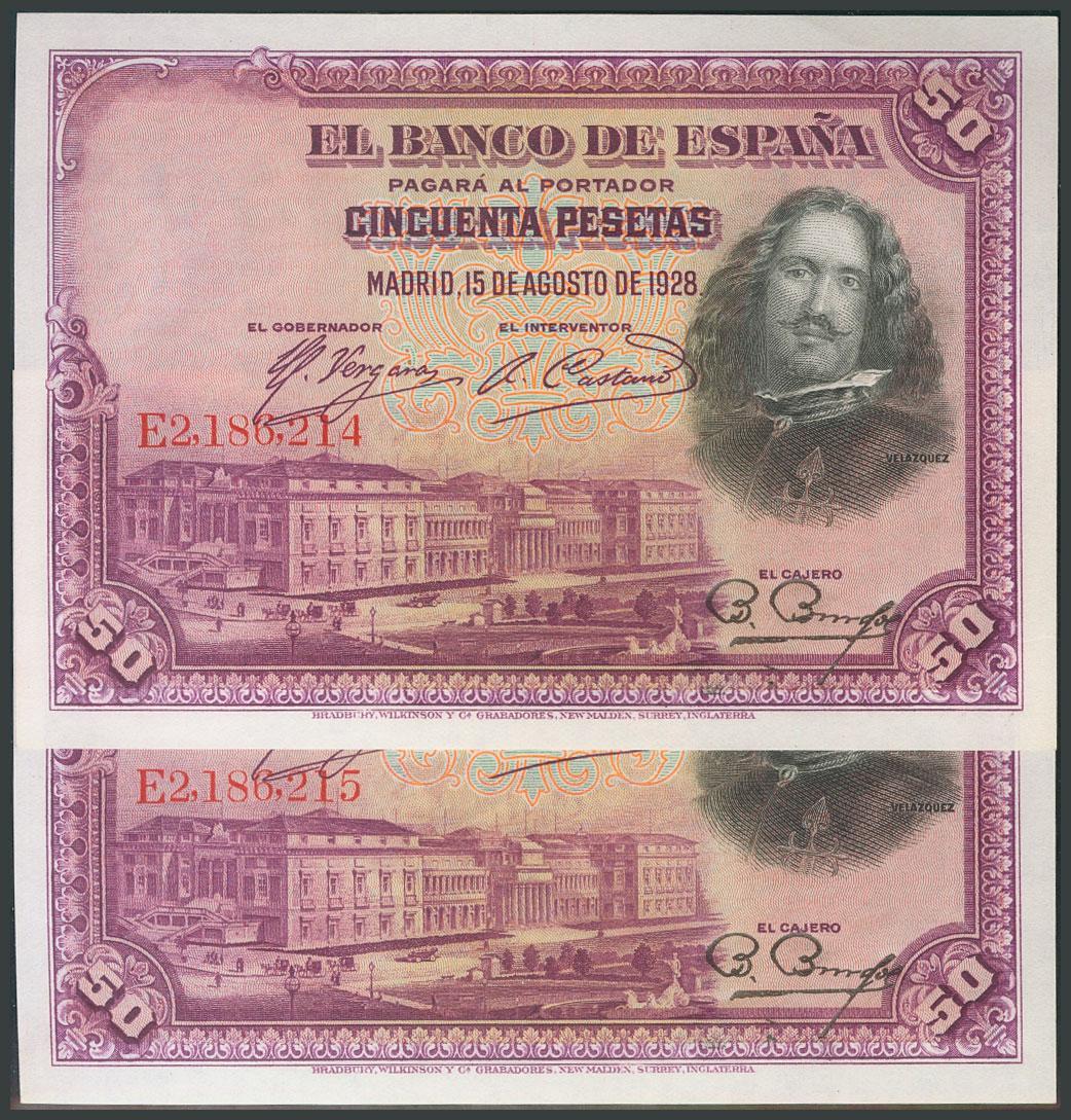 50 Pesetas. 15 de Agosto de 1928. Pareja correlativa. Serie E. (Edifil 2017: 354). Apresto original. SC.
