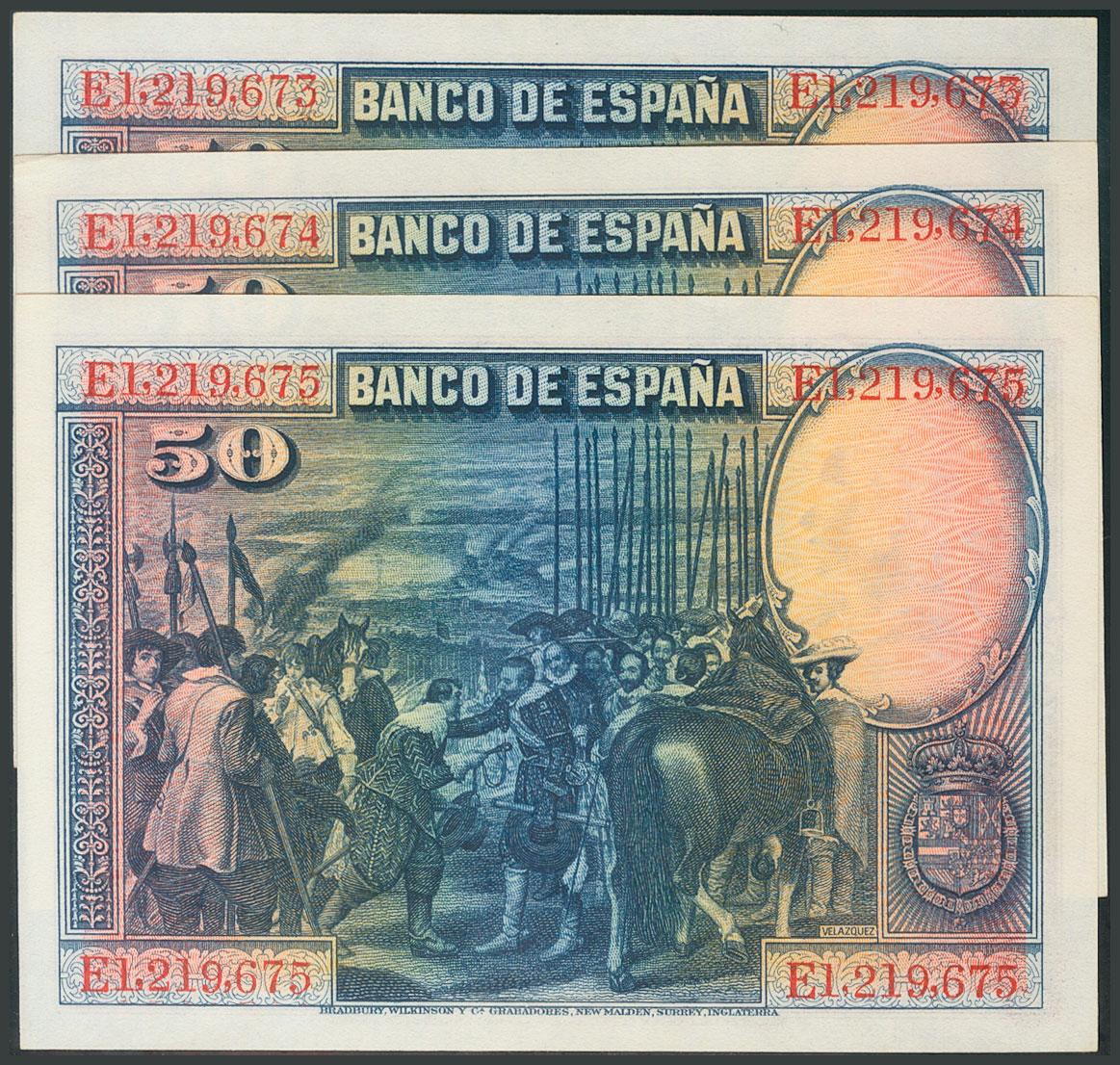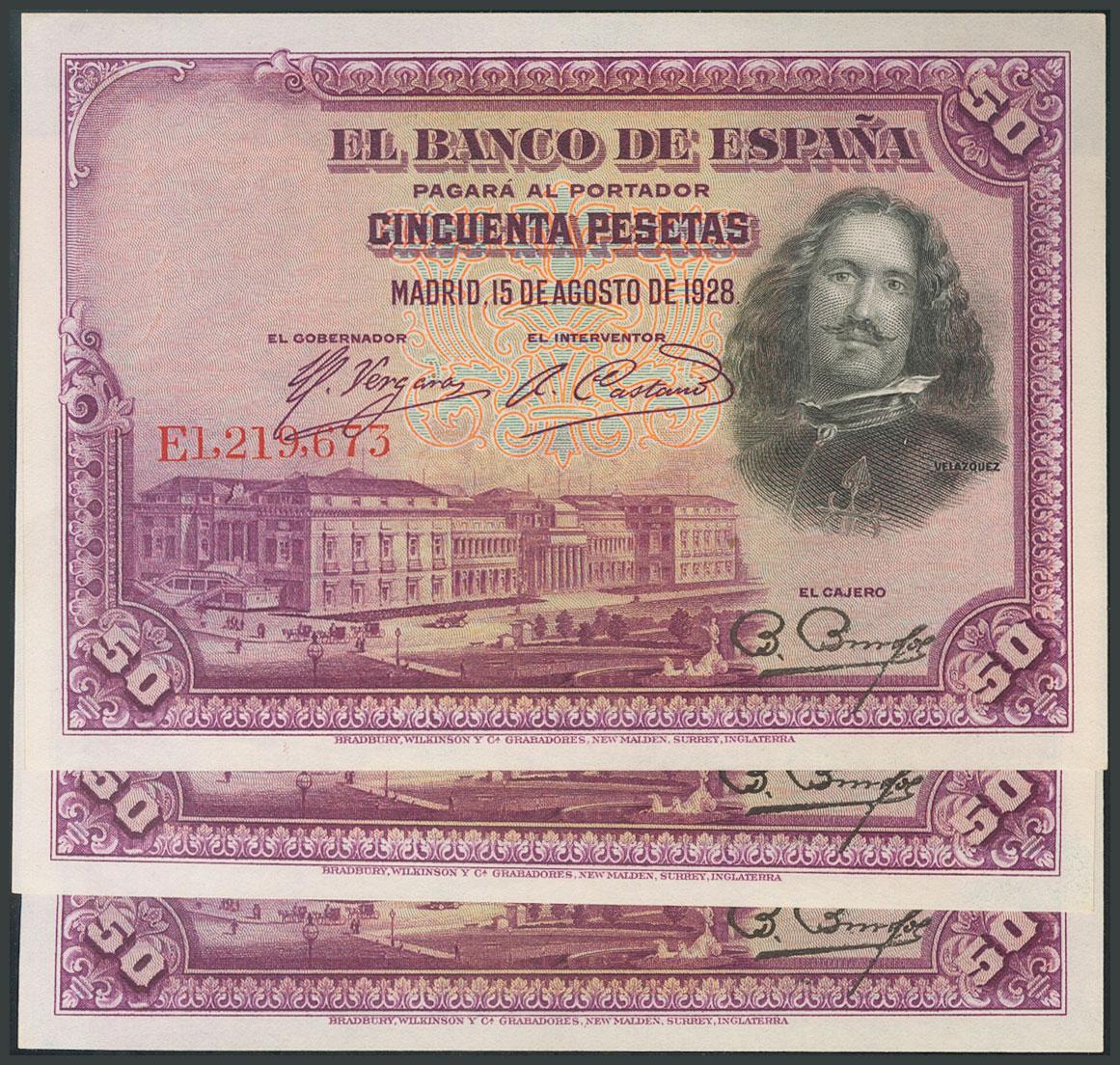 50 Pesetas. 15 de Agosto de 1928. Trío correlativo. Serie E. (Edifil 2017: 354). Apresto original. SC/SC-.