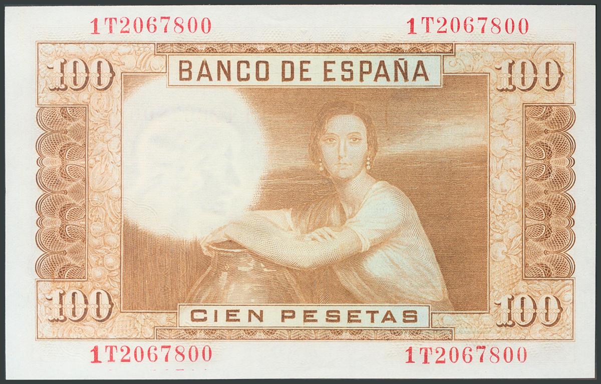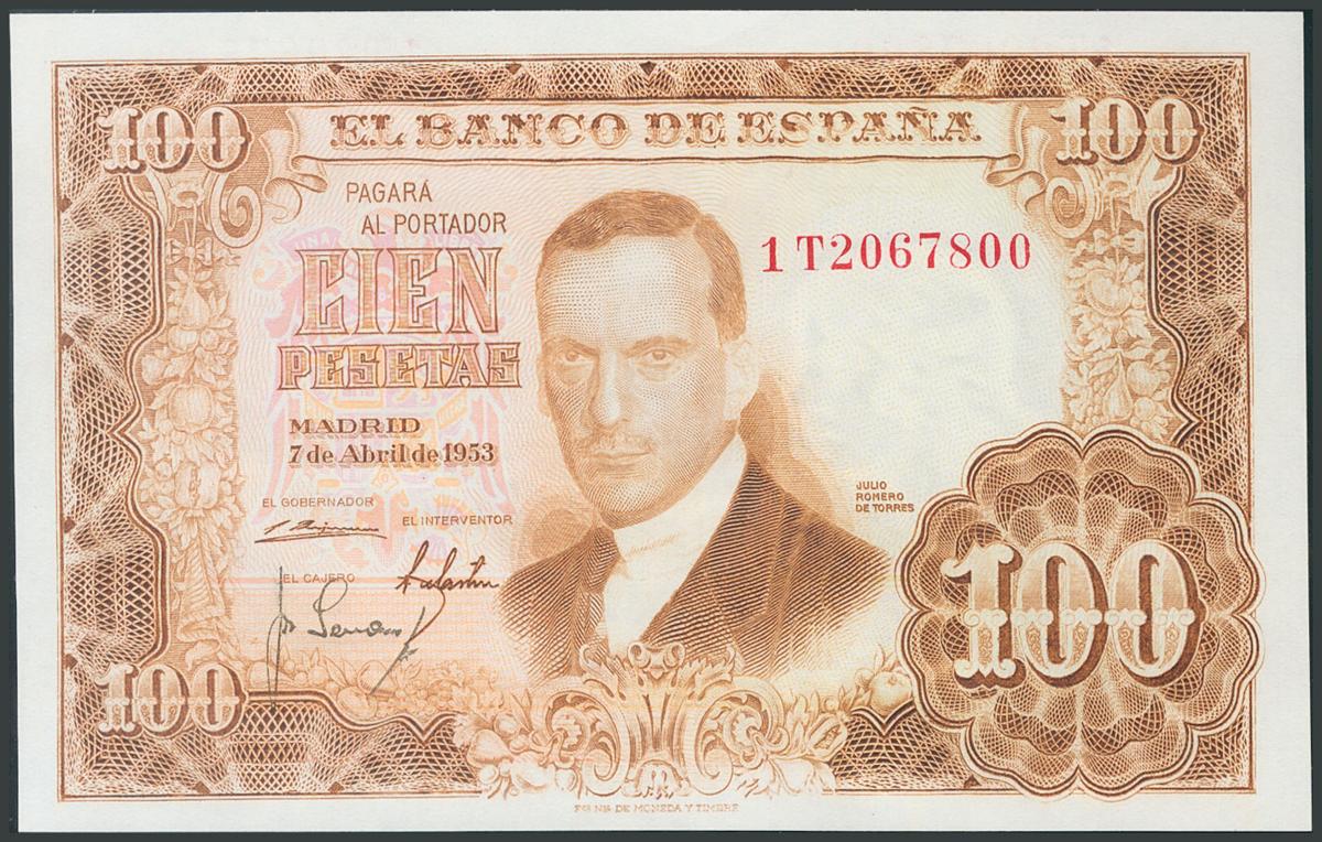 100 Pesetas. 7 de Abril de 1953. Serie 1T. (Edifil 2017: 464c). Apresto original. SC-.