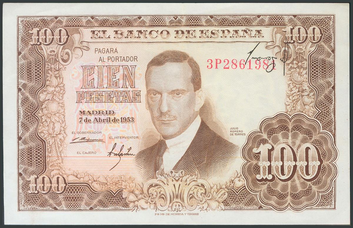 100 Pesetas. 7 de Abril de 1953. Serie 3P. Firma desplazada e invertida. (Edifil 2017: 464c). Muy rara, no catalogada, conserva gran parte del apresto original. EBC.