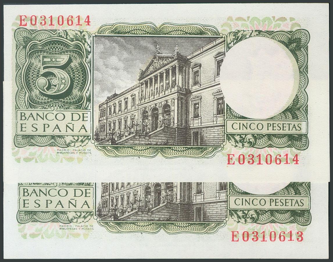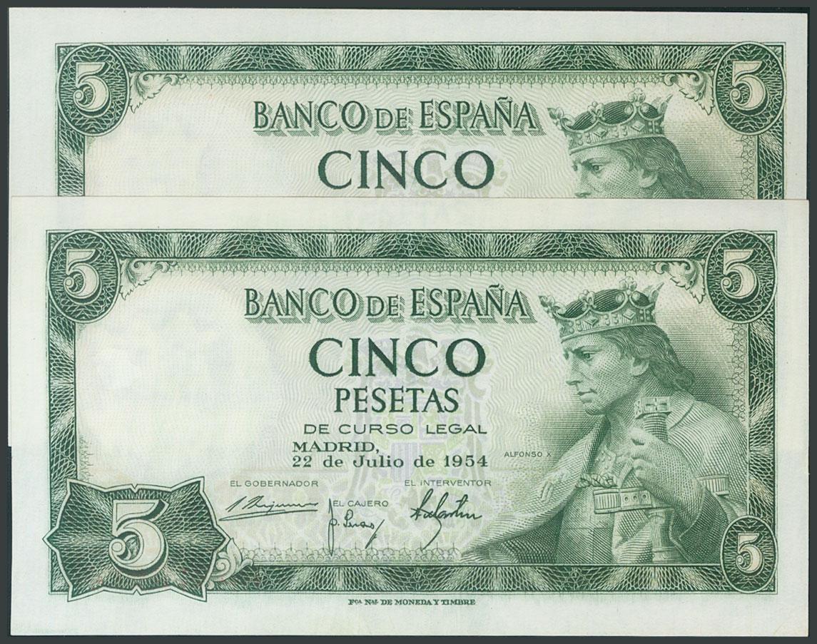 5 Pesetas. 22 de Julio de 1954. Pareja correlativa. Serie E. (Edifil 2017: 466a). Apresto original. SC.