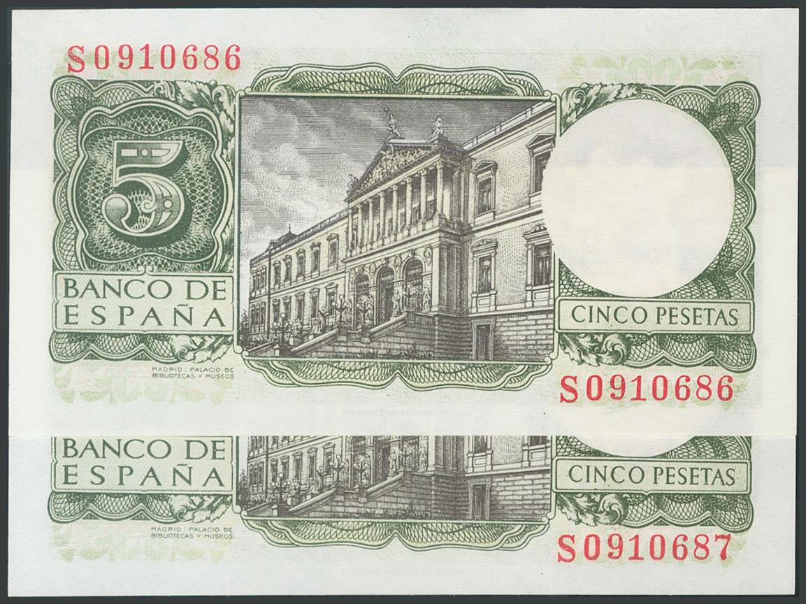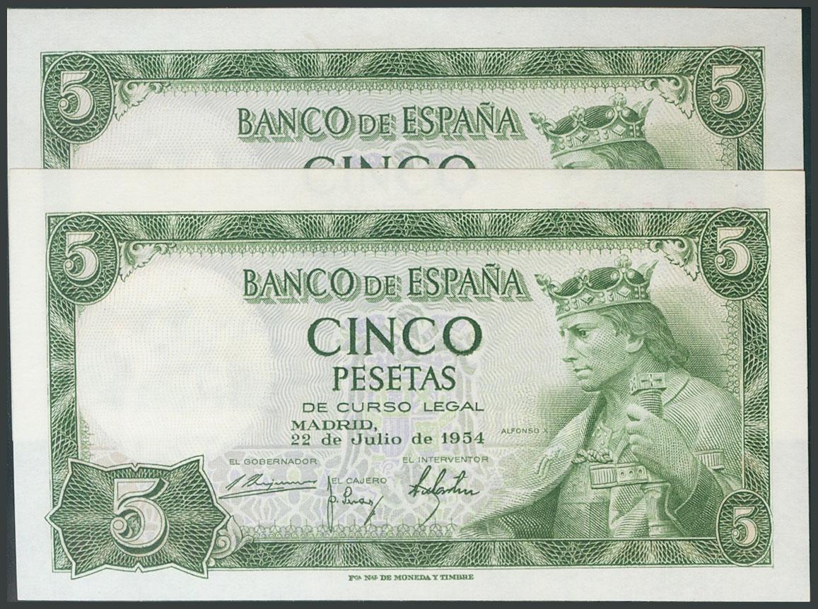 5 Pesetas. 22 de Julio de 1954. Pareja correlativa. Serie S. (Edifil 2017: 466a). Apresto original. SC.