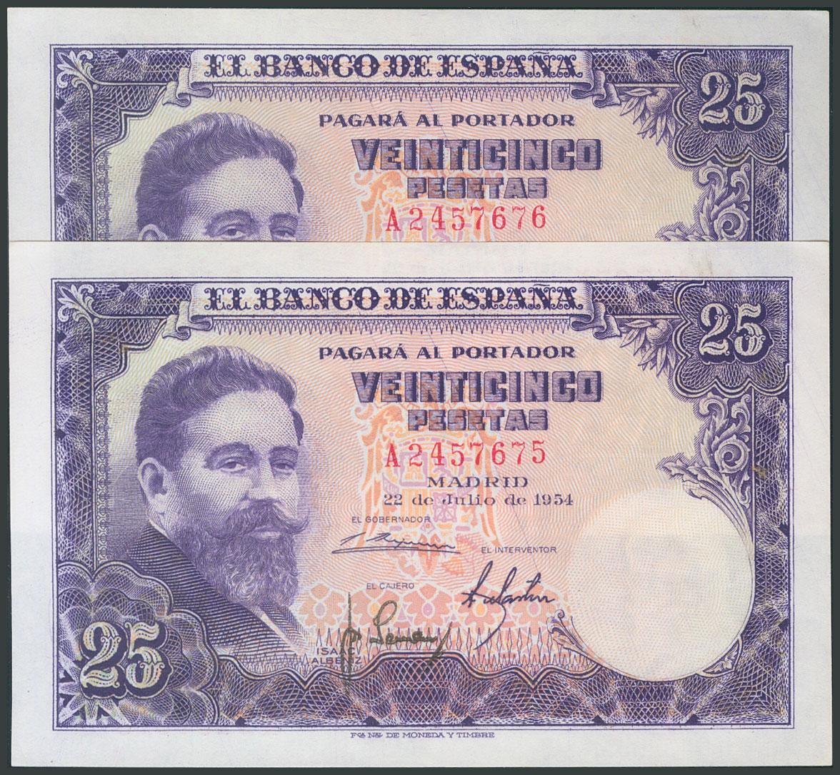 25 Pesetas. 22 de Julio de 1954. Pareja correlativa. Serie A. (Edifil 2017: 467a). Apresto original. SC-.