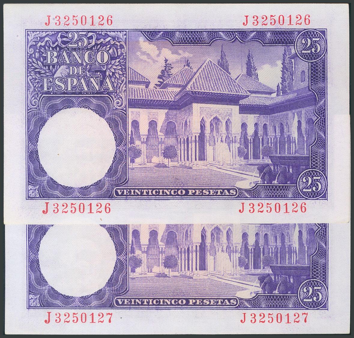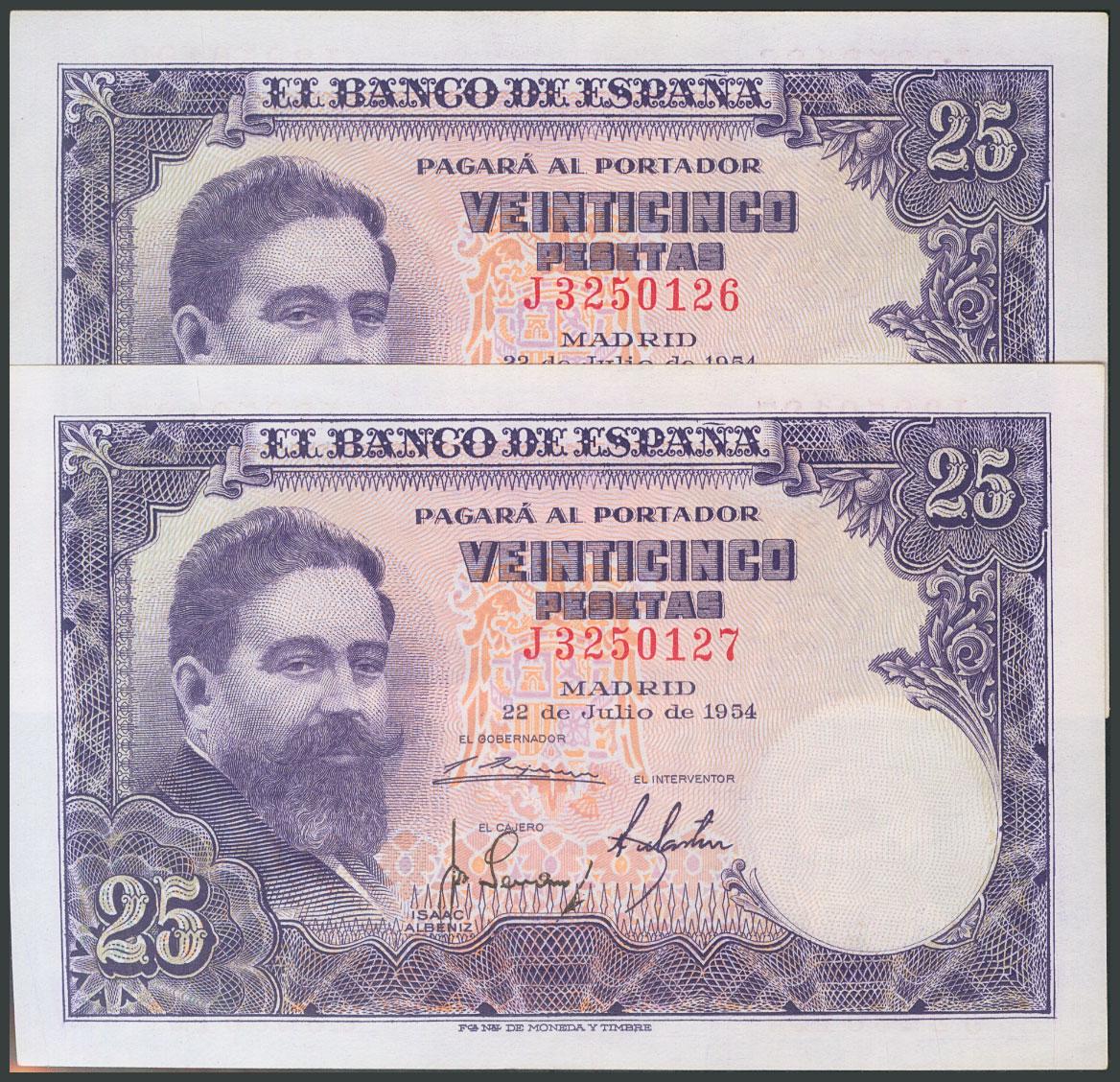 25 Pesetas. 22 de Julio de 1954. Pareja correlativa. Serie J. (Edifil 2017: 467a). Apresto original. SC-.