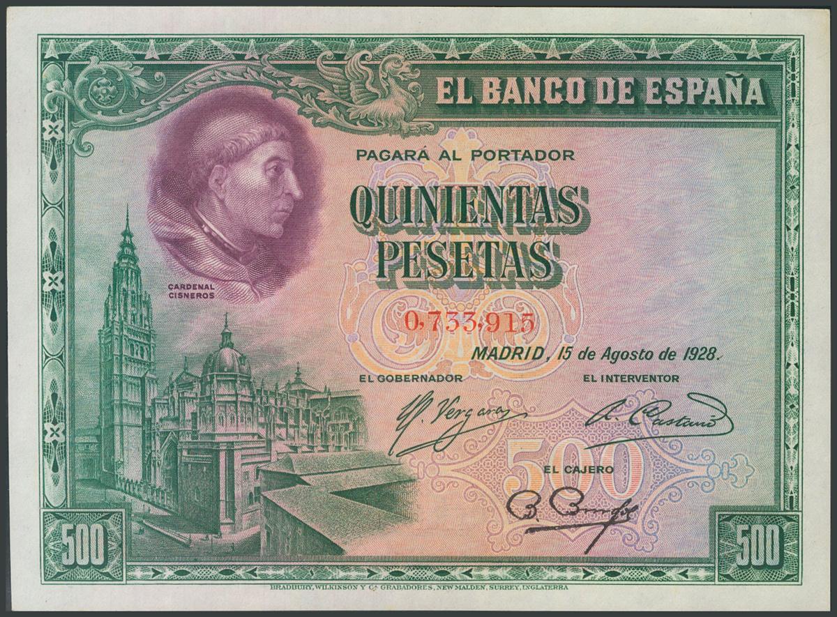 500 Pesetas. 15 de Agosto de 1928. Sin serie. (Edifil 2017: 356). SC.