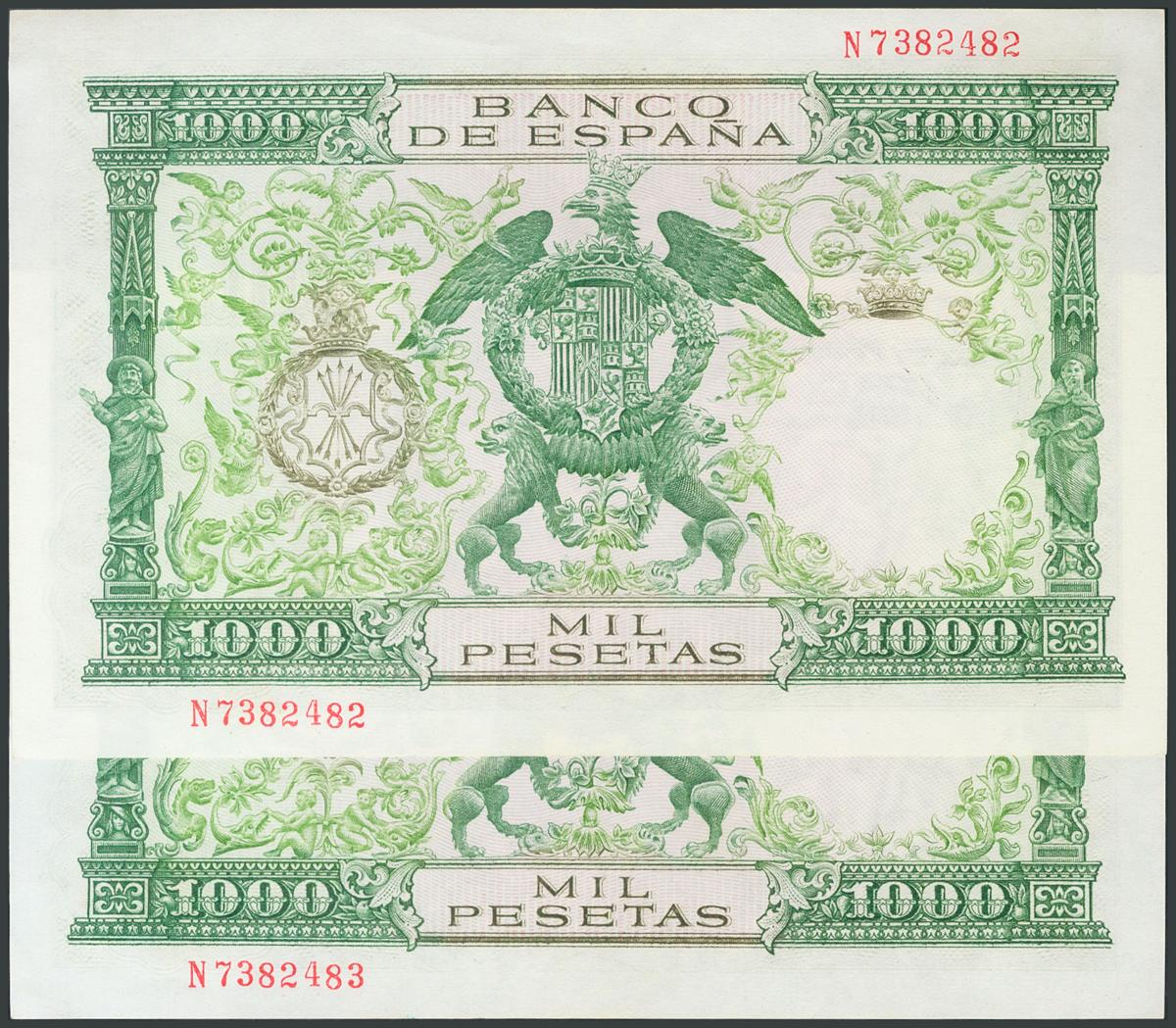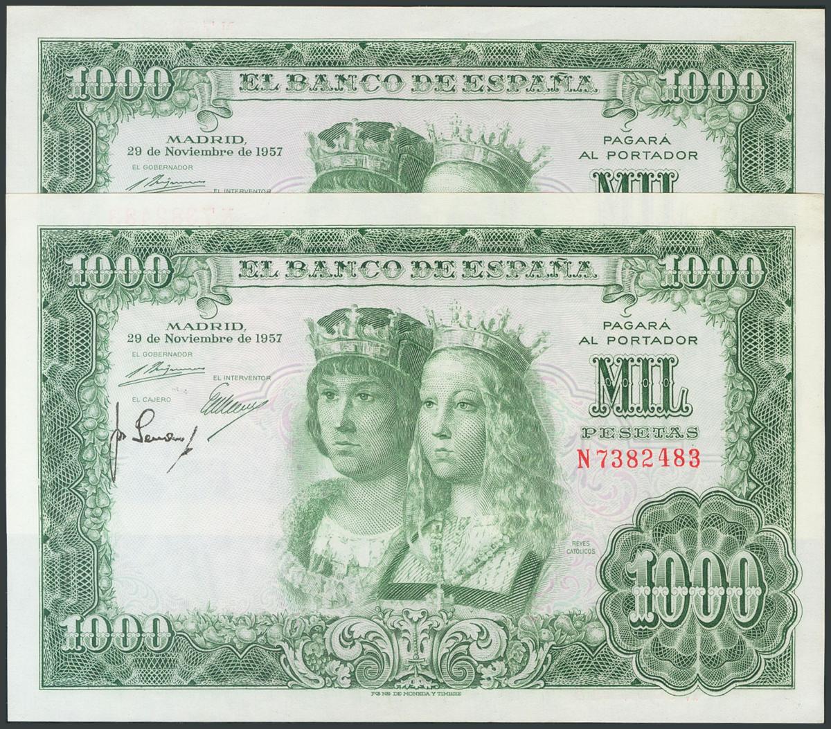 1000 Pesetas. 29 de Noviembre de 1957. Pareja correlativa. Serie N. (Edifil 2017: 469b). Inusual. SC-.