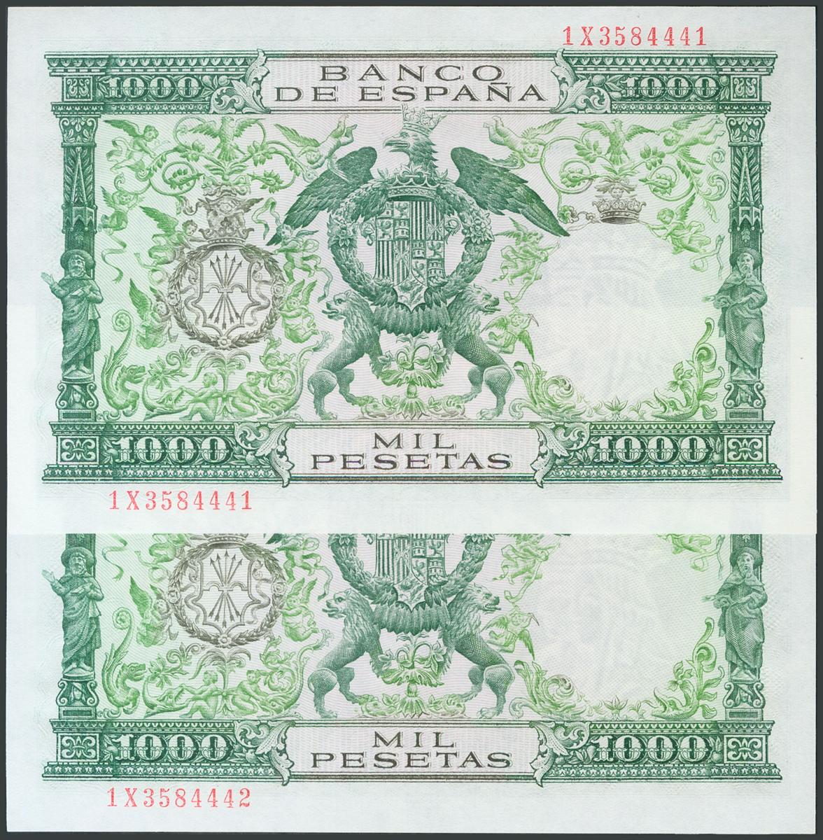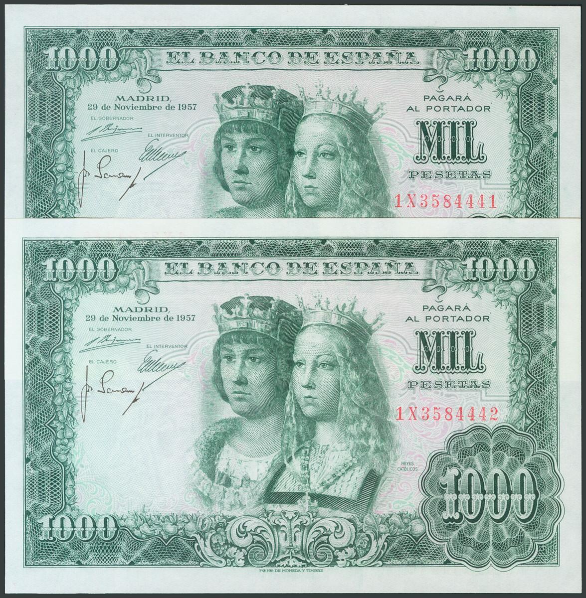 1000 Pesetas. 29 de Noviembre de 1957. Pareja correlativa. Serie 1X. (Edifil 2017: 469b). Apresto original. SC.