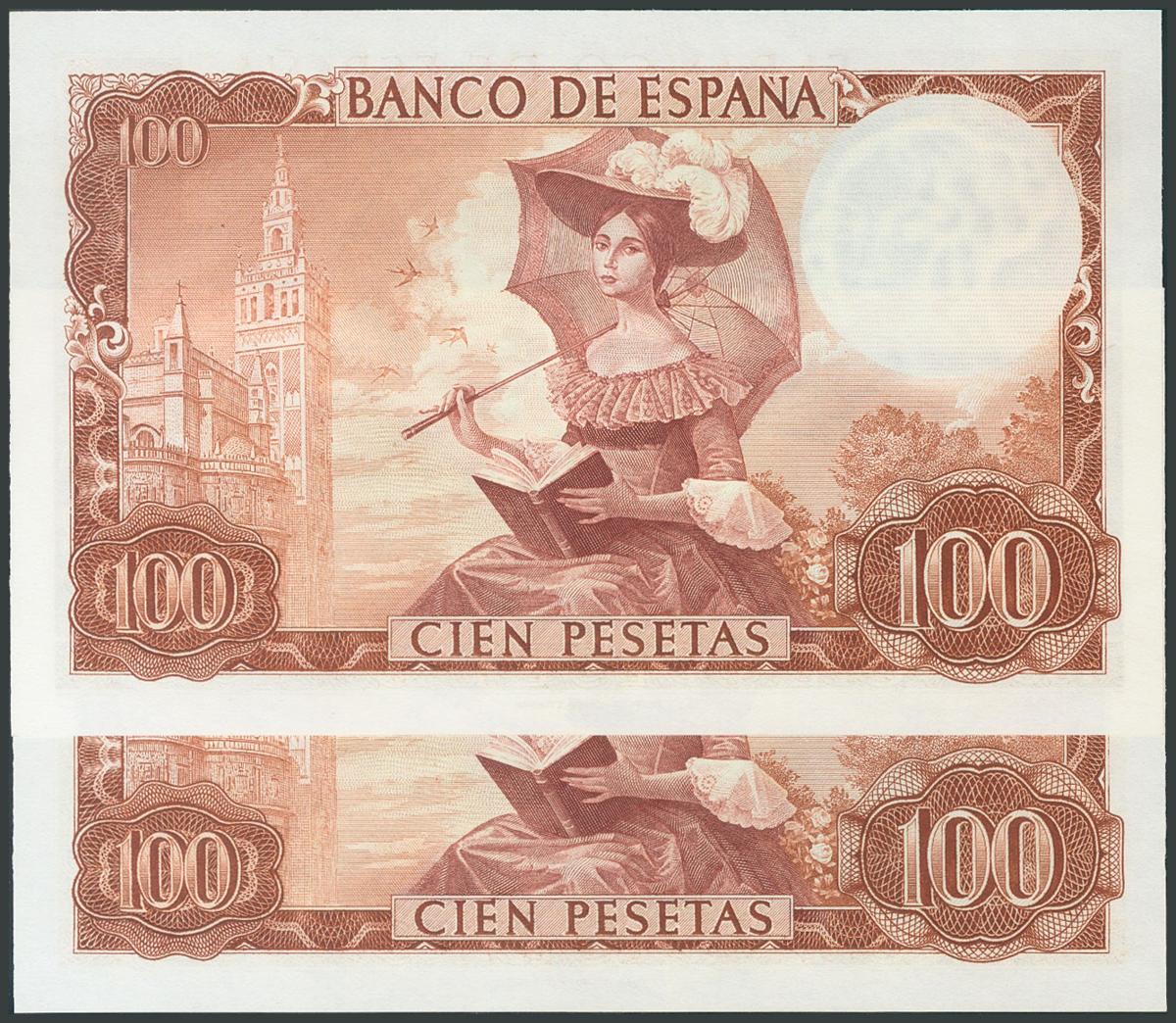 100 Pesetas. 19 de Noviembre de 1965. Pareja correlativa. Sin serie. (Edifil 2017: 470). SC.