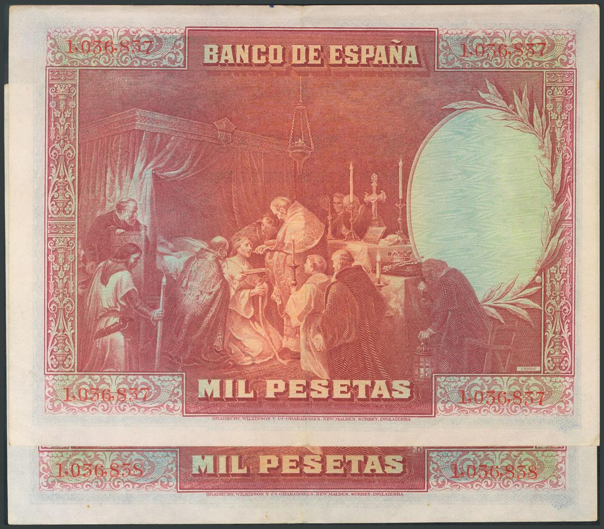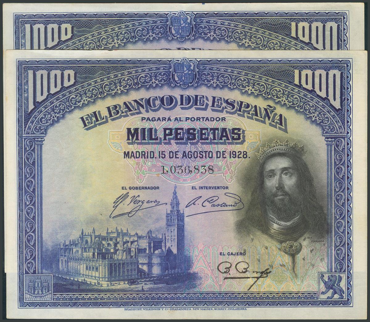 1000 Pesetas. 15 de Agosto de 1928. Pareja correlativa. Sin serie. (Edifil 2017: 357). Conserva gran parte del apresto original. EBC.