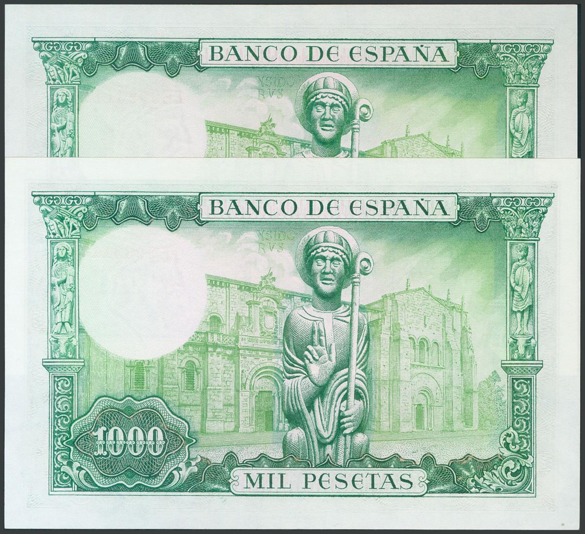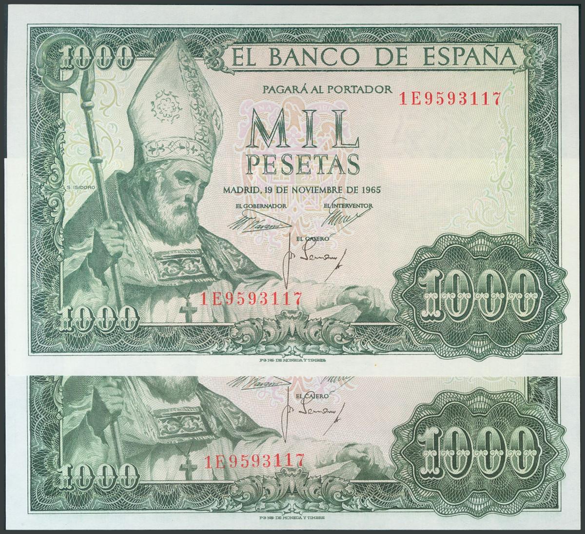 Impresionante conjunto de 2 billetes de 1000 Pesetas emitidos el 19 de Noviembre de 1965, los dos con la misma numeración y serie E. (Edifil 2017: 471b). Rarísimo. SC.