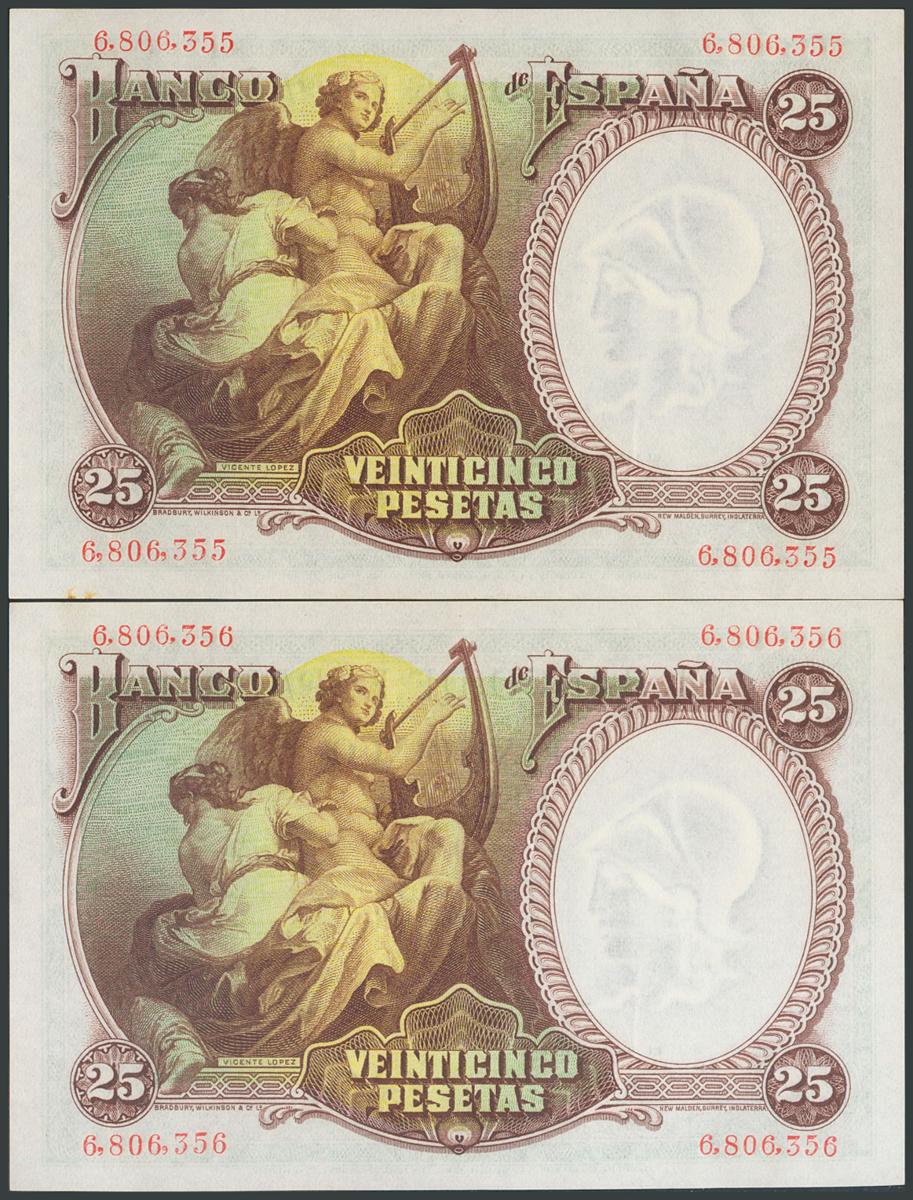 25 Pesetas. Pareja correlativa. Sin serie. (Edifil 2017: 358). Apresto original y un billete puntitos sin importancia en el margen inferior del reverso. EBC++.