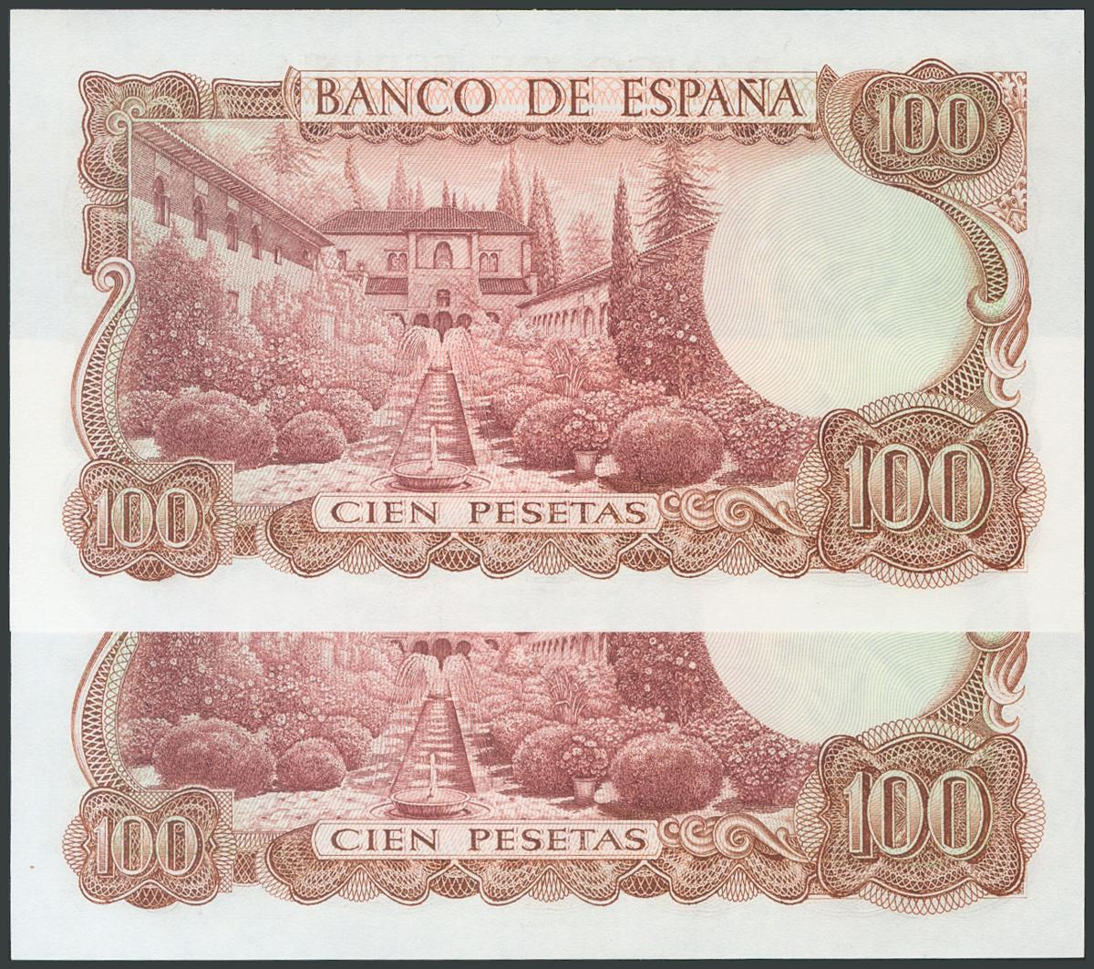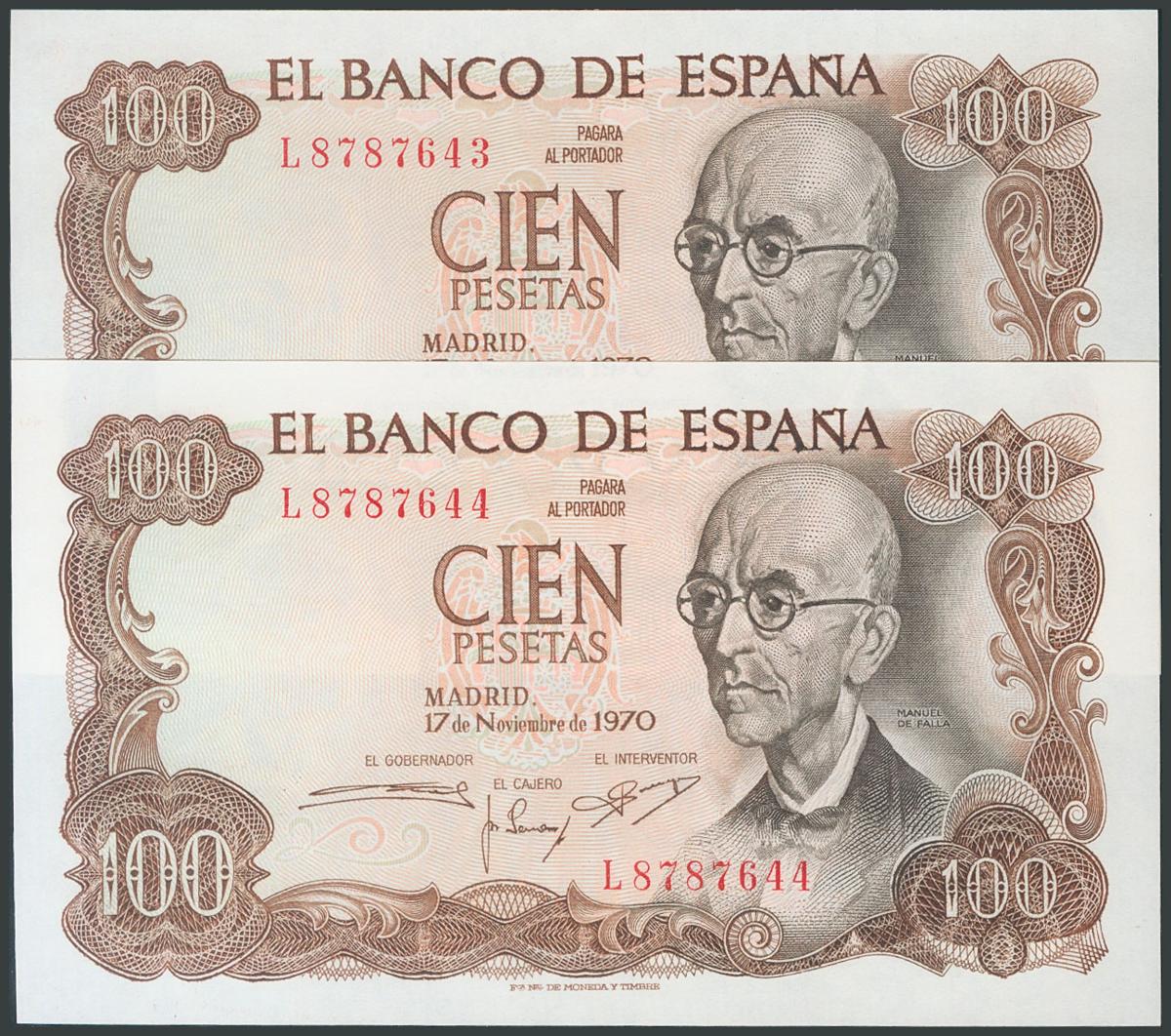 100 Pesetas. 17 de Noviembre de 1970. Pareja correlativa. Serie L. (Edifil 2017: 472b). Apresto original. SC.