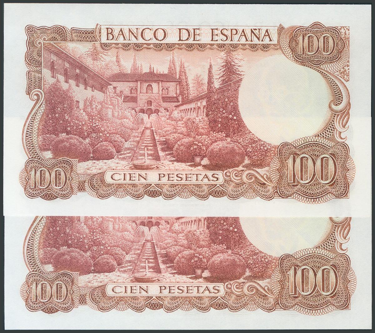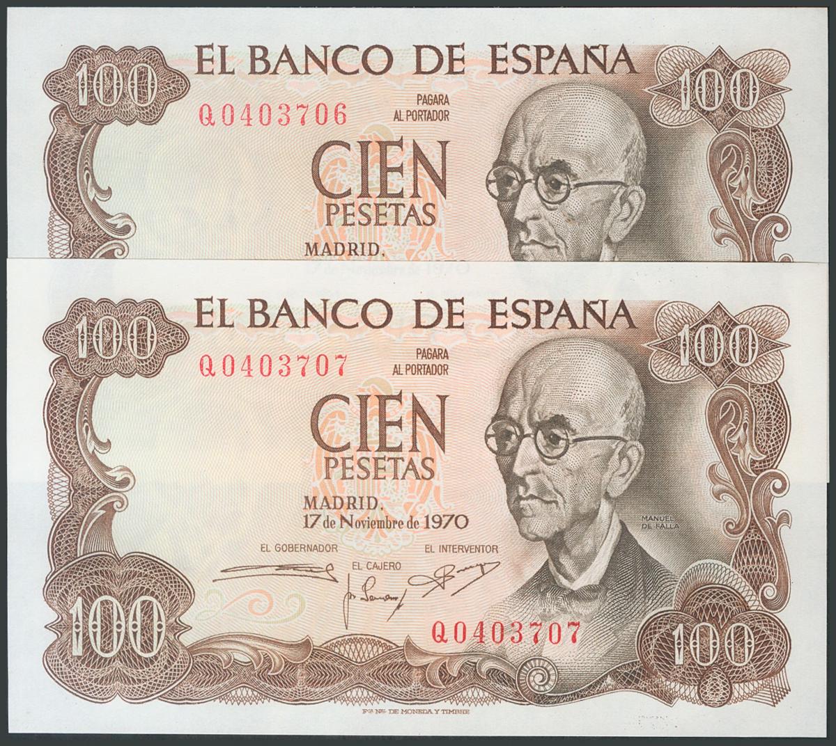100 Pesetas. 17 de Noviembre de 1970. Pareja correlativa. Serie Q. (Edifil 2017: 472b). Apresto original. SC.