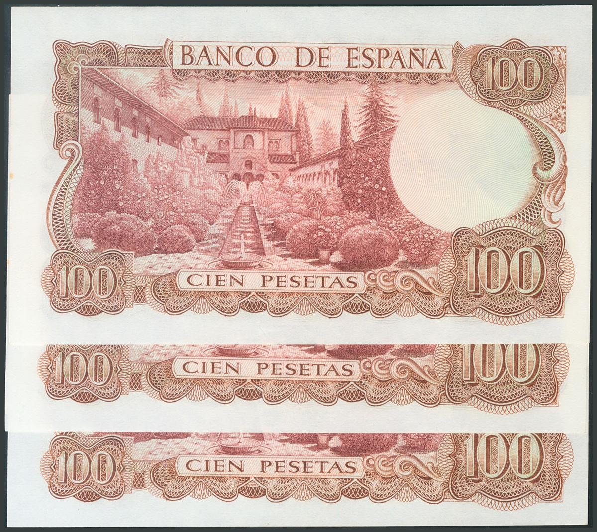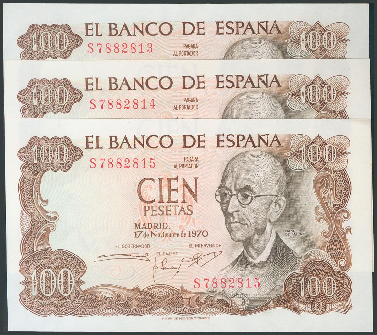 100 Pesetas. 17 de Noviembre de 1970. Trío correlativo. Serie S. (Edifil 2017: 472b). Apresto original. SC/SC-.