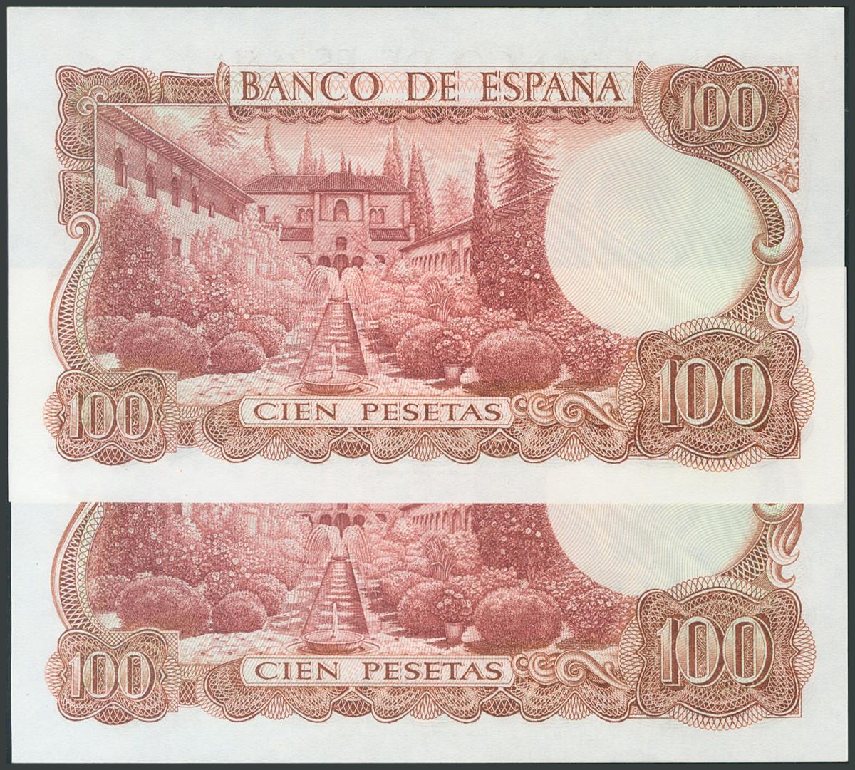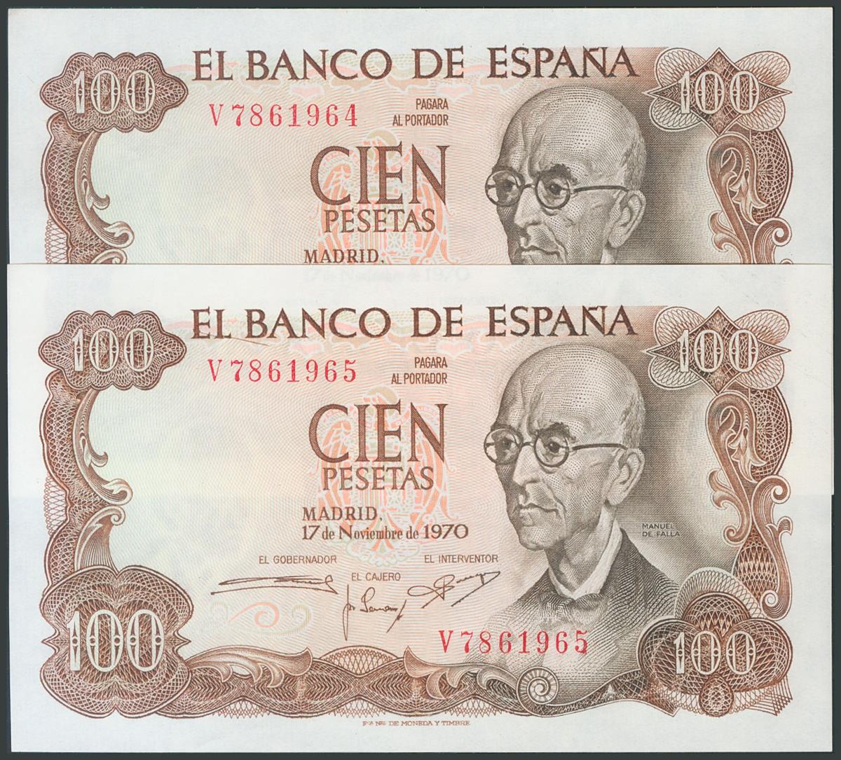 100 Pesetas. 17 de Noviembre de 1970. Pareja correlativa. Serie V. (Edifil 2017: 472b). Apresto original. SC.