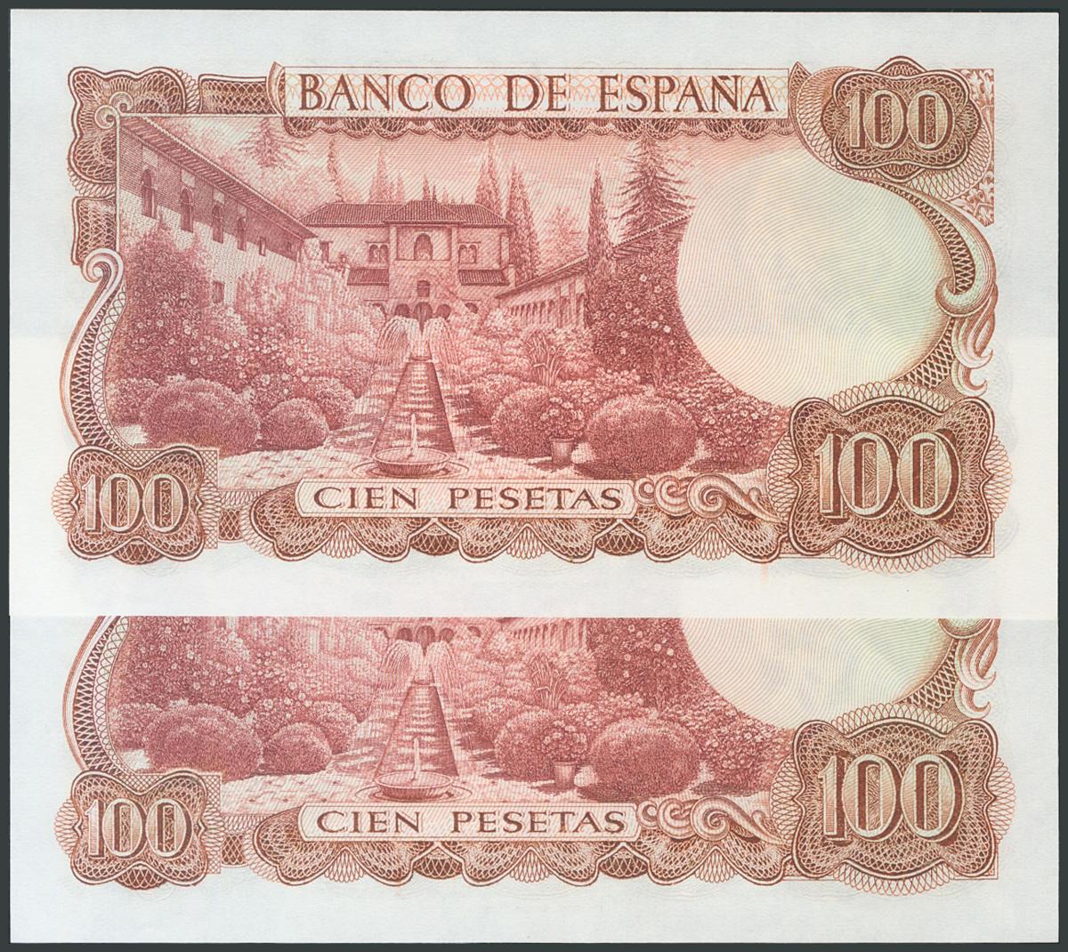 100 Pesetas. 17 de Noviembre de 1970. Pareja correlativa. Serie X. (Edifil 2017: 472b). Apresto original. SC.