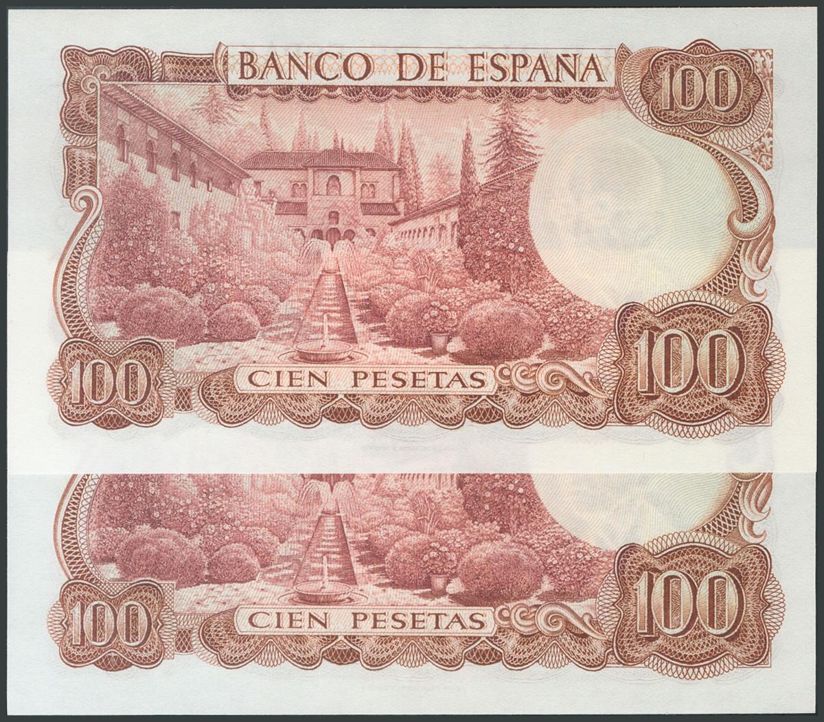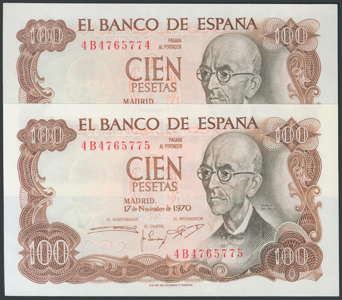 100 Pesetas. 17 de Noviembre de 1970. Pareja correlativa. Serie 4B. (Edifil 2017: 472c). Apresto original. SC.