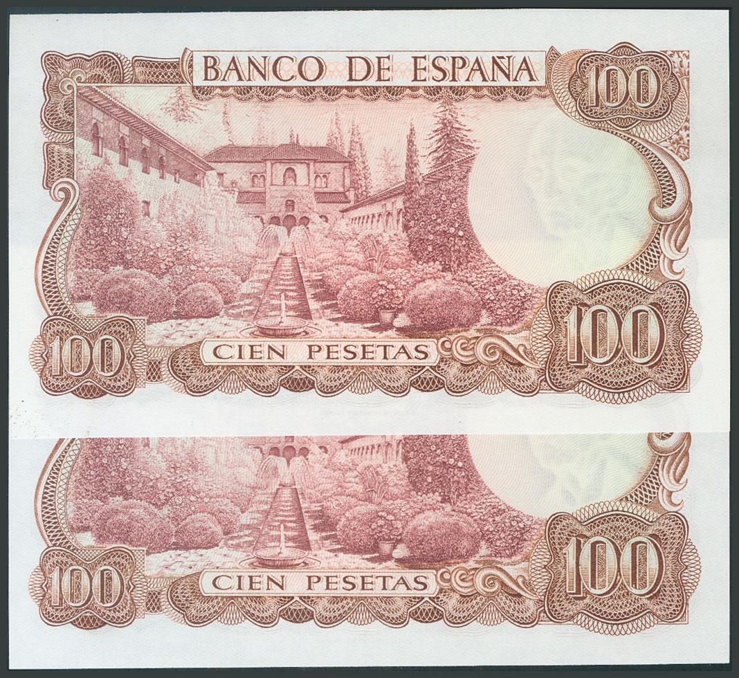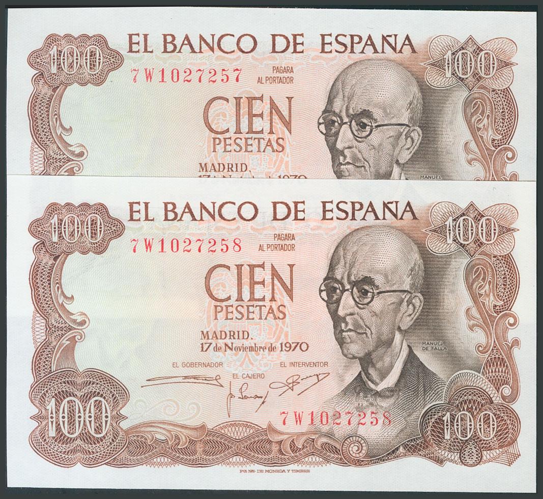 100 Pesetas. 17 de Noviembre de 1970. Pareja correlativa. Serie 7W, última serie emitida. (Edifil 2017: 472c). SC.