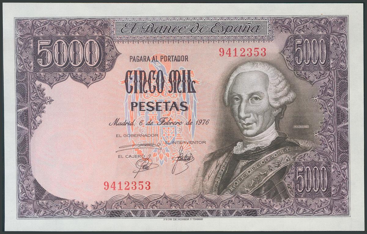 5000 Pesetas. 6 de Febrero de 1976. Sin serie. (Edifil 2017: 475). Apresto original. SC.