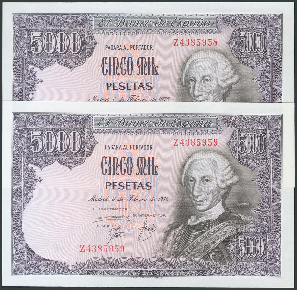 5000 Pesetas. 6 de Febrero de 1976. Pareja correlativa. Serie Z. (Edifil 2017: 475a). Apresto original. SC.