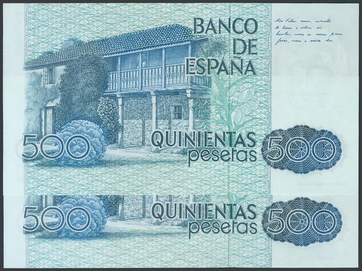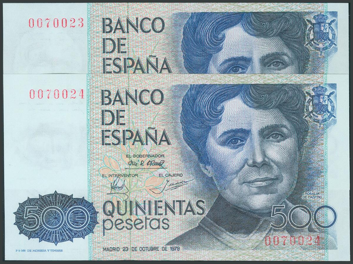 500 Pesetas. 23 de Octubre de 1979. Pareja correlativa. Sin serie y muy baja numeración. (Edifil 2017: 476). SC.