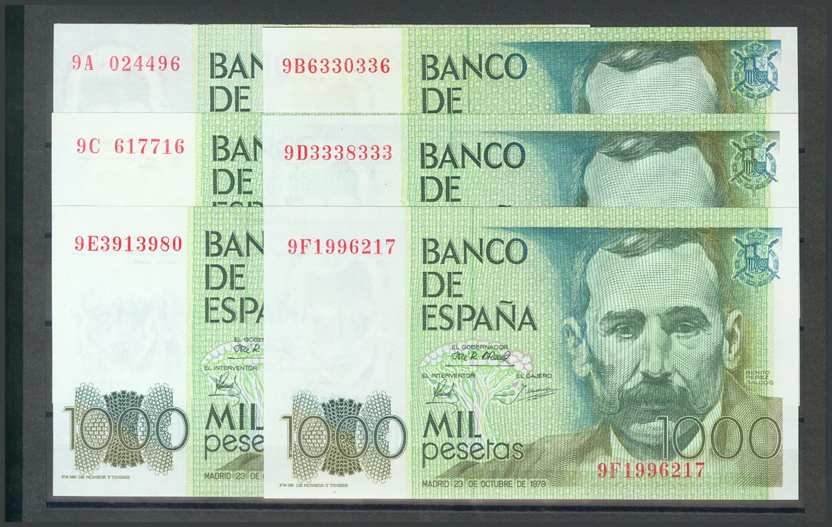 Espectacular y precioso conjunto de los 6 billetes de 1000 Pesetas emitidos el 23 de Octubre de 1979 con las series especiales empezando por 9 (A, B, C, D, E y F). (Edifil 2017: 477b). Rarísimo conjunto. SC.